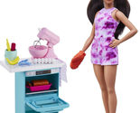 Inspire endless storytelling possibilities with this Barbie kitchen playset featuring an oven, prep counter, pet kitten and accessories themed to cooking and baking The oven opens and closes for realistic play, and the standing mixer spins with the press of a button! Accessories including cooking tools, a baking tray, oven mitt and more can be stored on the counter and shelving In a tie-dye romper and stylish slides, Barbie doll is ready for a day of play With a fun theme and so many storytelling pieces, this Barbie playset makes a great gift for 3 to 7 year olds, especially those that love cooking and baking!