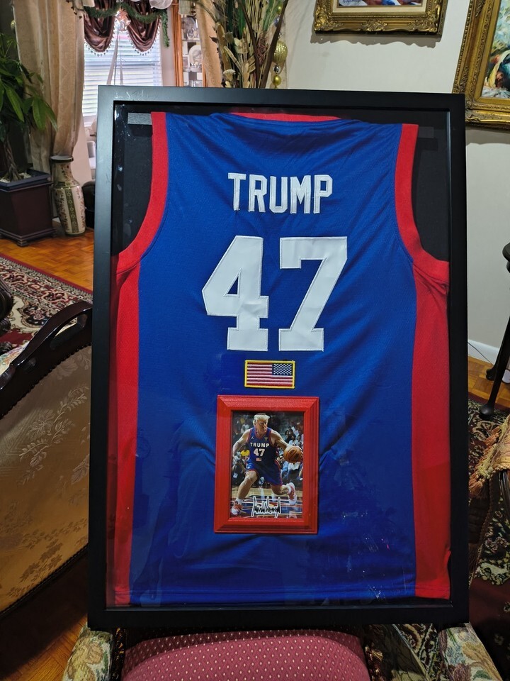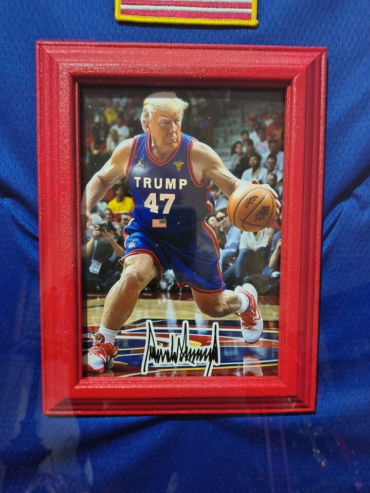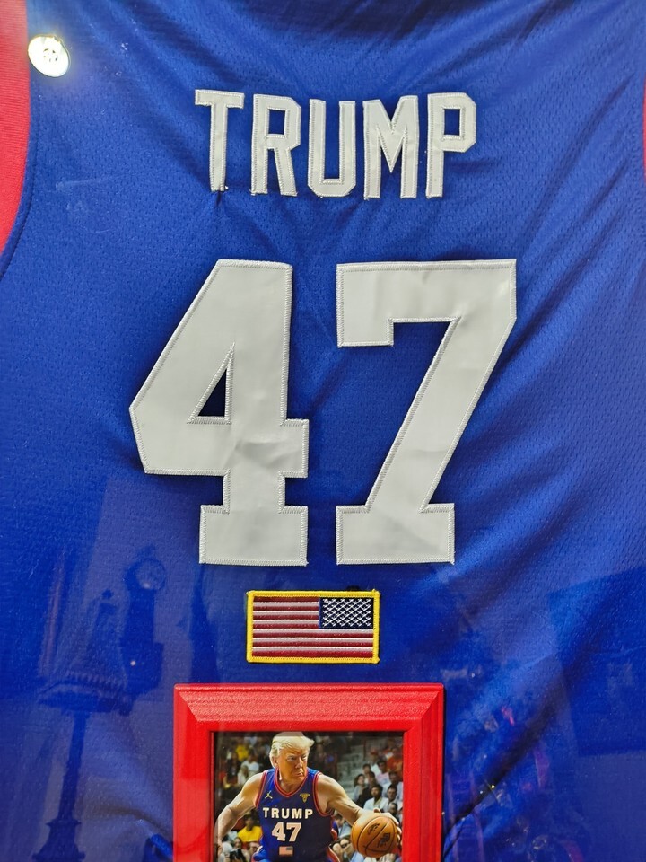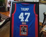 The product is a Donald J. Trump USA Jersey featuring the number 47, representing his presidential campaign year of 2025. The jersey bears the slogan "Let's Make America Great Again" and is themed around politics, specifically related to Donald Trump's candidacy for the United States presidency. Made in the United States, this collectible item is a symbol of support for Trump's political campaign and a reminder of his candidacy for the 2025 presidential election.