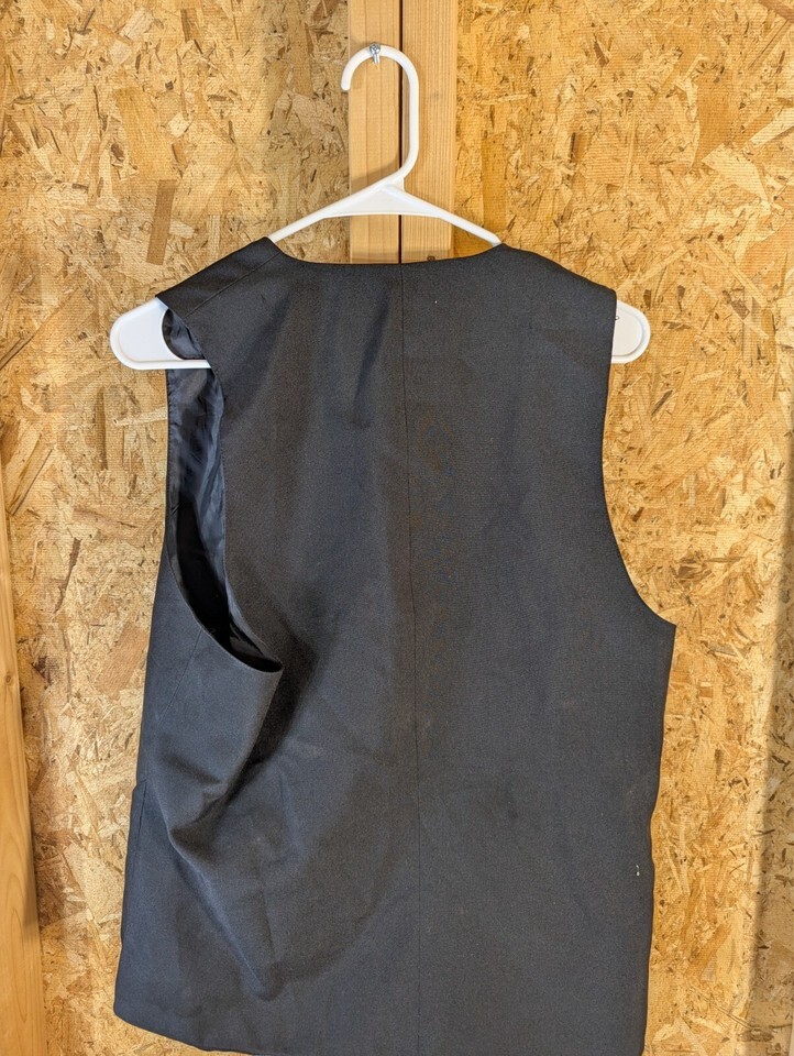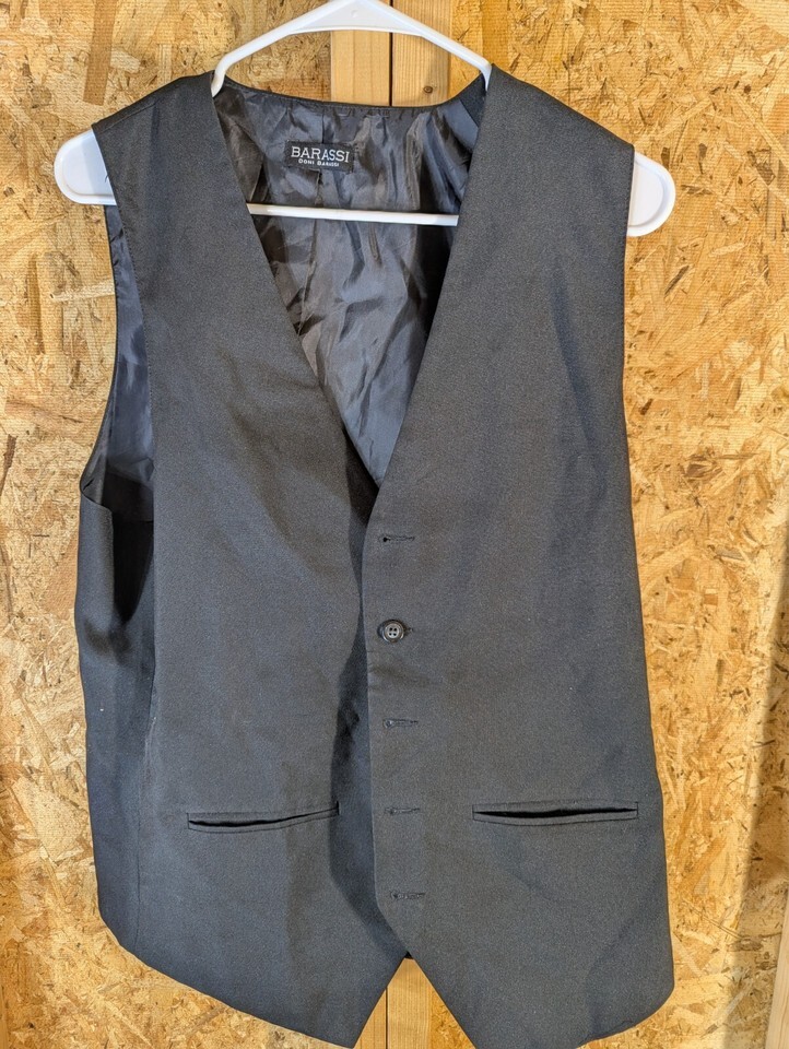 This is a black polyester five-button vest for men, designed by Doni Barassi in size 40R. It is suitable for formal occasions such as weddings. The vest has a solid pattern and is made in China.