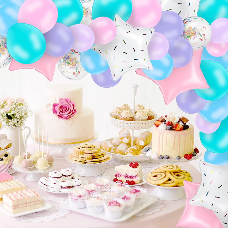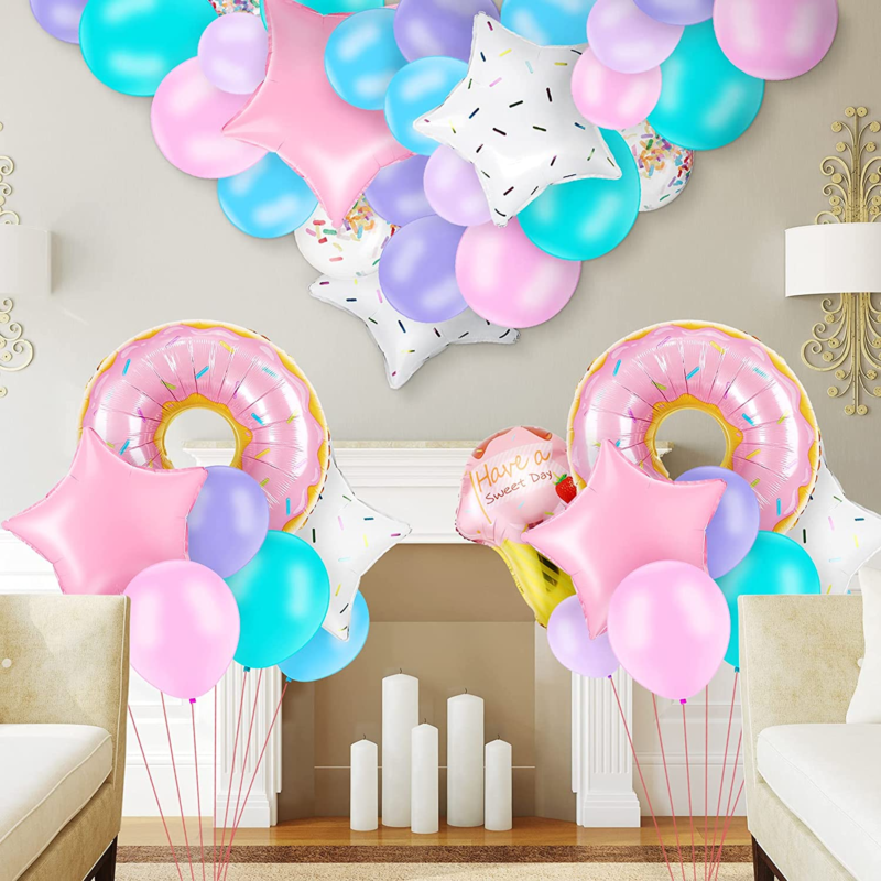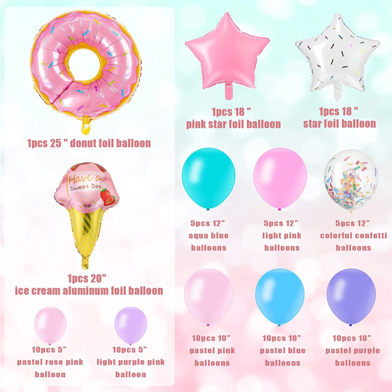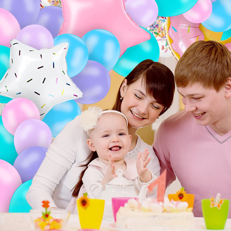 Diverse balloons set: you will get 1 pink donut aluminum foil balloon, 1 pink cone aluminum foil balloon , 5 long paper balloons, 10 matte balloons in 12 inch, 2.8 g (blue, pink), 30 thickened matte balloons in 10 inch, 2.2 g (light pink, light blue, light purple), 20 macaron balloons in 5 inch (light blue, light purple), 1 candy 5-pointed star aluminum foil balloon, 1 pearl powder 5 pointed star aluminum foil balloon, sufficient quantity to meet your party decorative needs