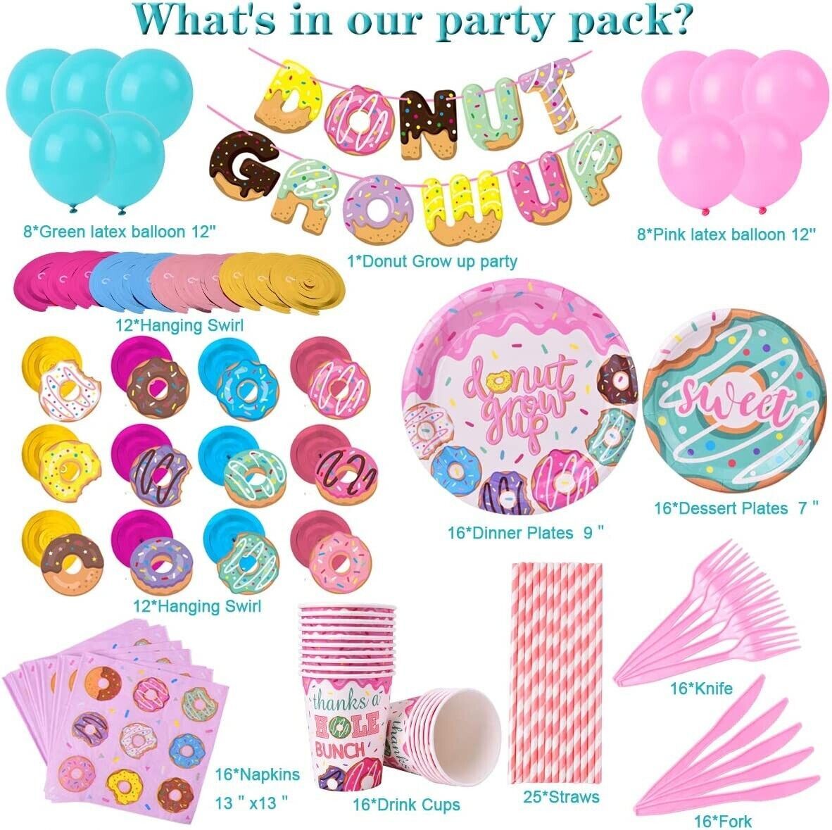 ?DONUT PARTY TABLEWARE :Everything included in one box . The package of 151 pcs for 16 guests ,It include:1*DONUT GROW UP banner,16*paper plates(9 inches),16*paper plates (7 inches ), 16*knifes,16*forks,16*napkin,16*paper straws,16*paper cups,16 donut swirls ,and 15 *latex balloons