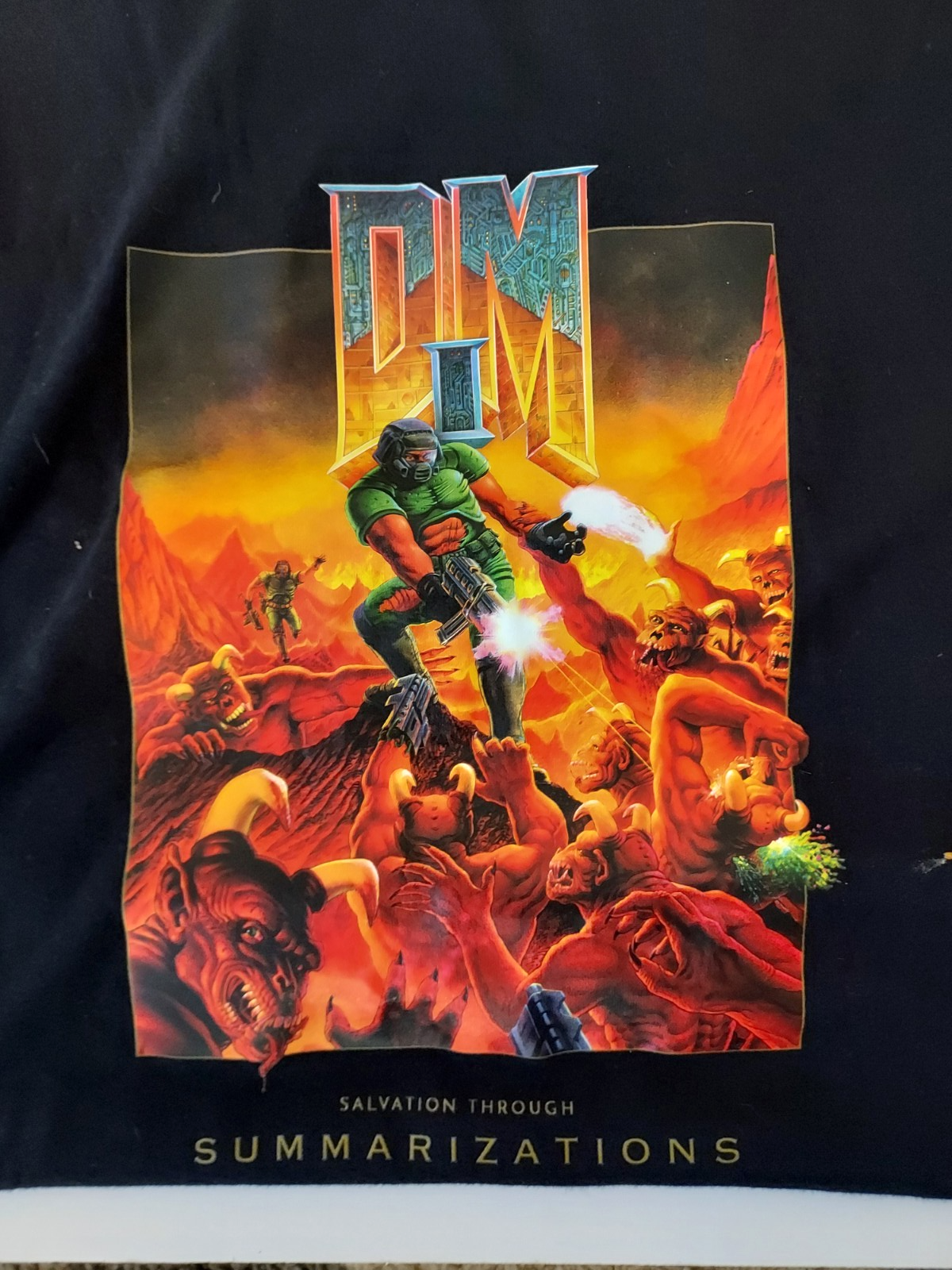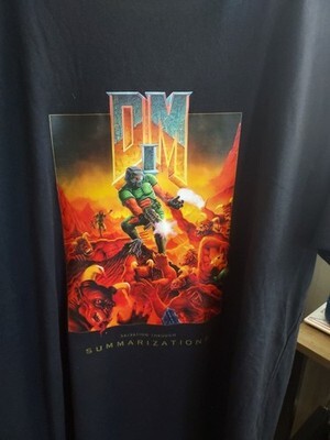 This cool looking shirt appears to be a company called Aumni doing a Doom-like graphic for their slogan. The top says DMI and the bottom says "Salvation Through Summarizations".