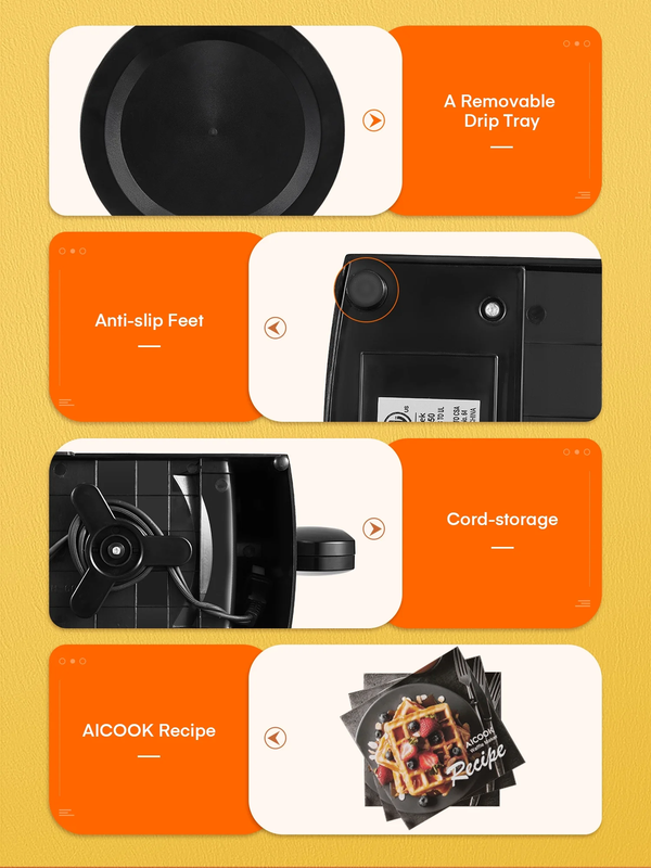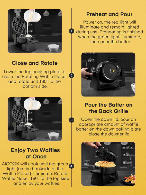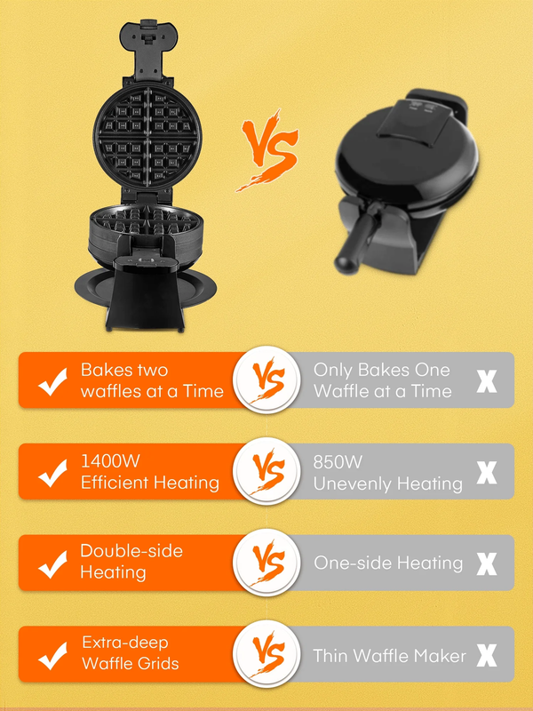 1. Quality or Cost-reduction? There are numerous models on the market touted as 'cost-effective,' appearing fancy at first glance. However, these are often machines that have been compromised in quality to reduce costs, leading to functional issues during usage. Their internal components are also designed with cost-cutting in mind, resulting in shorter service lives. Our objective isn't to blindly pursue cost reduction. Instead, we've opted to step away from the frenzied price wars and offer products at a reasonable price point without compromising on quality. Our aim is to consistently meet the daily needs of our customers with products that boast higher quality and sustainability. 2. Two Waffles at Once - Faster More! Save time by cooking Two 7" Round, .99" Deep Thick Fluffy Mouthwatering Belgian waffles at once. No more need to bake a bunch of waffles in advance and freeze them. Big families can say goodbye to frozen waffles and enjoy fresh Belgian waffles anytime. 3. 1400W - Waffles in 2 Minutes! Two sets of high-efficiency Double-Sided baking waffle plates and 1400W High Power contribute to a superior and faster cooking process and evenly distributed heat that lets you bake yummy Belgian waffles that are crispy on the outside and perfectly cooked on the inside in 3 minutes (4 minutes tops). 4. Safety Matters The Most! When both stainless steel double waffle makers commonly found on the market and double waffle makers have their internal heating tubes reach the same temperature, the material difference becomes crucial for safety. Our anti-scald ABS plastic housing boasts a higher specific heat capacity, ensuring a significantly lower surface temperature than the stainless steel casing in other waffle makers, minimizing the risk of burns and prioritizing your safety. 5. 180 Rotation Cooking System - Fluffier Evener! 180 flip-style waffle makers ensure the batter is equally distributed for evenly cooked, fluffy waffles, browned on both the top and the bottom with no bald spots. 6. One-Piece Design Non-removable Integrated Design won't let the batter spill into the heating pipe chamber and cause uncleanable spots and burning incidents. The baking plates fit tightly, the heat won't escape, which shortens the baking process, and baking results are more consistent. 7. Easier to Clean! This waffle maker is easy to clean only with a damp cloth, Durable nonstick coating releases the waffles easily after cooking without sticking or tearing. 8. Healthier Lifestyle! Get rid of "fancy" restaurant waffles with excess unhealthy sugars and oil to reach a sweeter taste and browner crust, you can make your own at home and customize them any way you like, vegan and keto waffles, try fewer sugars and less fat waffles now!!! 9. Good Product in The Detail! Double indicator lights tell you when power is on and the timing to add batter; the cool-touch handles are easy to hold, lock, and flip; the nonstick interior and the drip tray make for an easy clean-up. 10. NOTE! 1) FILL THIS SIDE FIRST: Whether you want to make one or two waffles, pour the batter on the side pasting the tips first, that's the secret to success. (Please don?t tear off the tip, in case you forget which side to use first.) 2) Try a Small Amount Of Batter First: It is a matter of trial and error to get the desired consistency, so try a small amount of batter first in case it overflows. 11. Purchased Without Worries Refer to the user manual for troubleshooting steps and related policies. In addition, a creative recipe guide for waffle beginners and waffle pros. 24h friendly FOHERE customer service. Product condition: new.