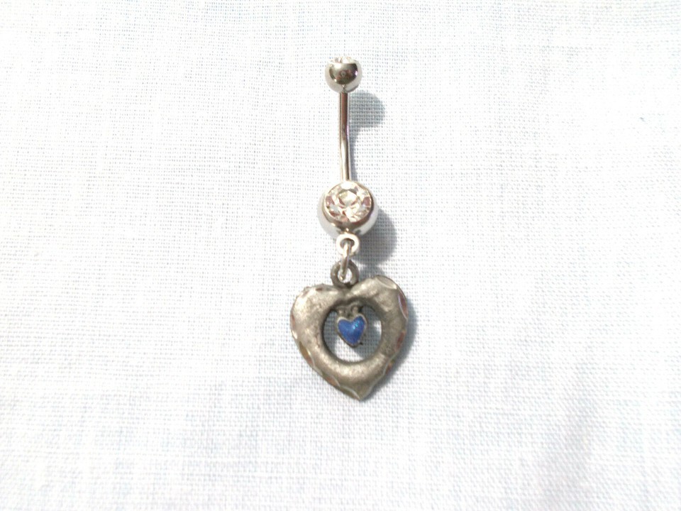 14 gauge surgical stainless steel navel barbell with an AMERICAN MADE PEWTER HEART WITH ENGRAVED EDGES AND A BLUE CENTER HEART on a CLEAR CZ STONE BANANA BAR