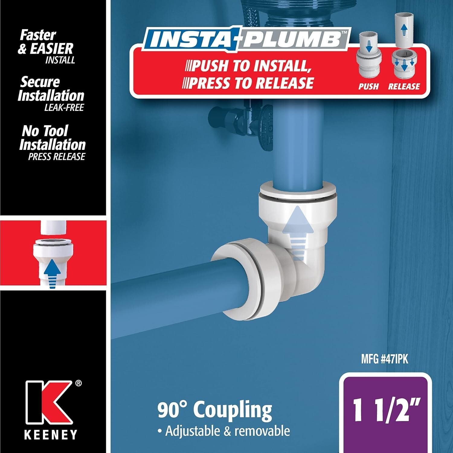 Drainage Coupling 90 1-1/2" D Plastic White - Keeney 47IPK Insta Plumb