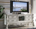 Grandly display your TV, with the grand and elegant Dresden TV stand. The gorgeous bone white finish is highlighted with hand-brushed silver accents to help enhance the beautiful trim details. This TV stand features a scalloped edge and four side drawers that offer plenty of space for remotes and manuals. In addition, a glass shelf for media devices with a cable management hole. With plenty of storage to offer this TV stand will help keep a clutter-free living space. The entertainment center is sold separately.