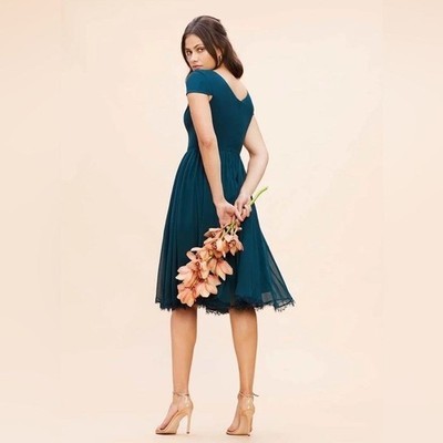 The charming but sophisticated Corey dress in Pine pairs a fitted crepe bodice with a softly gathered chiffon skirt. Cap sleeves add coverage to balance the sultry plunging v-neckline and curved v-back of this design. A scalloped lace hem dresses up the midi-length skirt for special events.