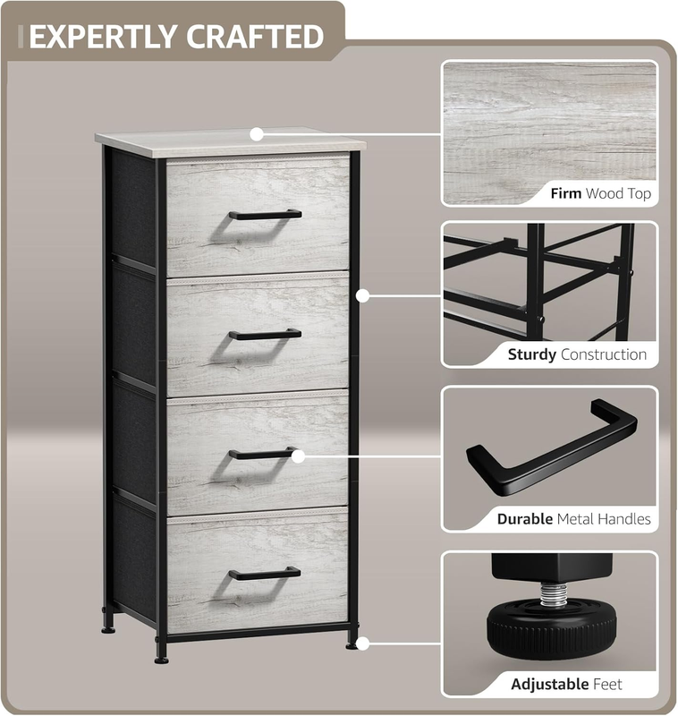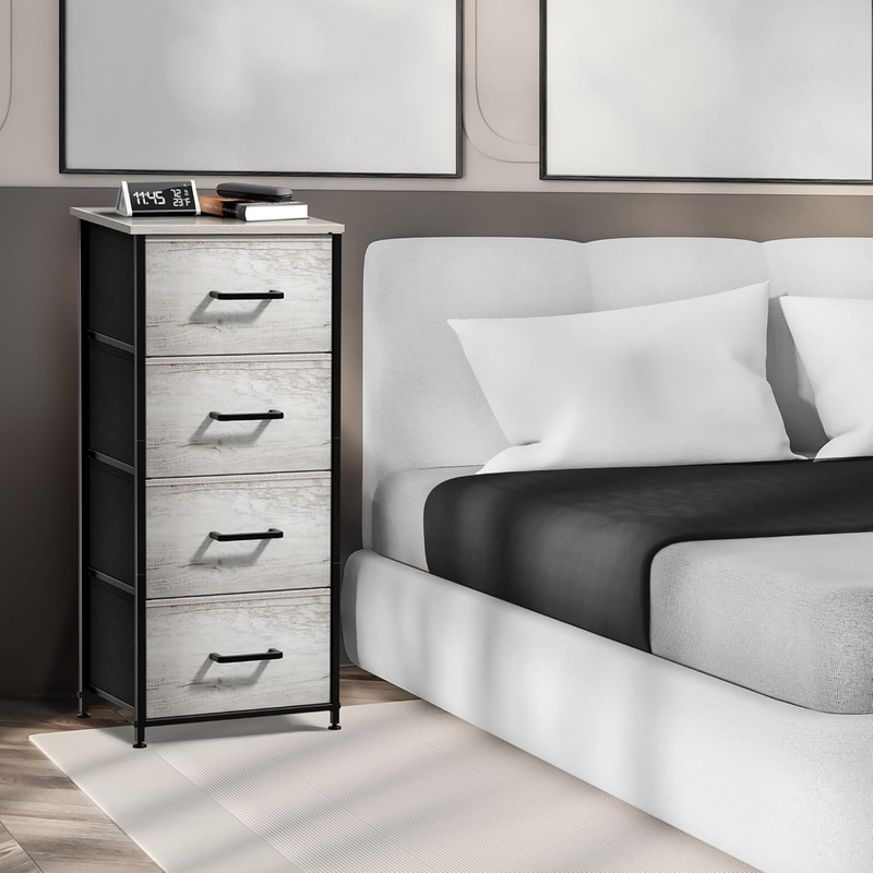 Spacious Storage: The 4 fabric drawers of the small dresser offer large storage space for nighttime necessities with Each drawer is approximately 8 inches deep. The wood top is ideal to place alarm clock, phone, charger, eyeglasses, keeping them in your reach.