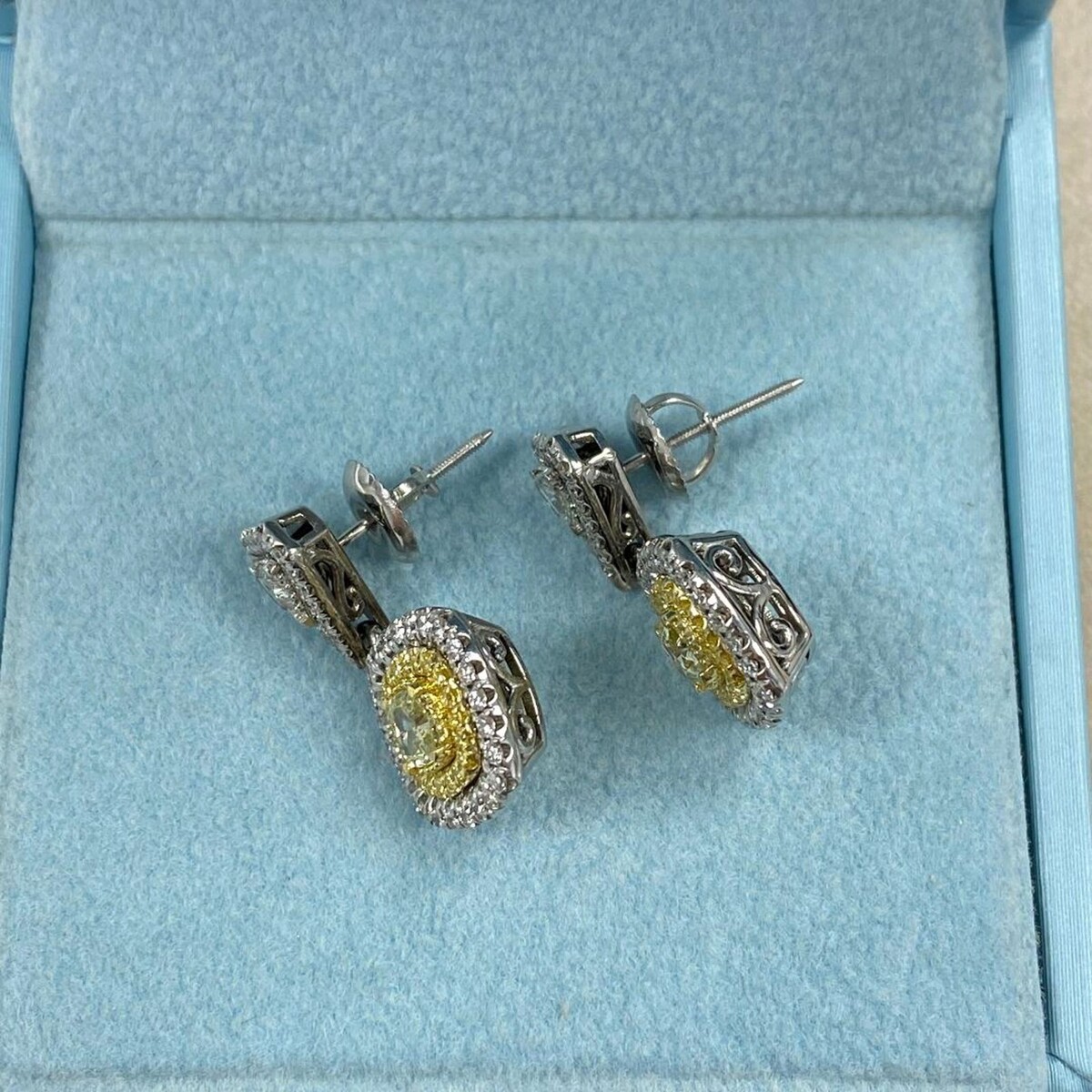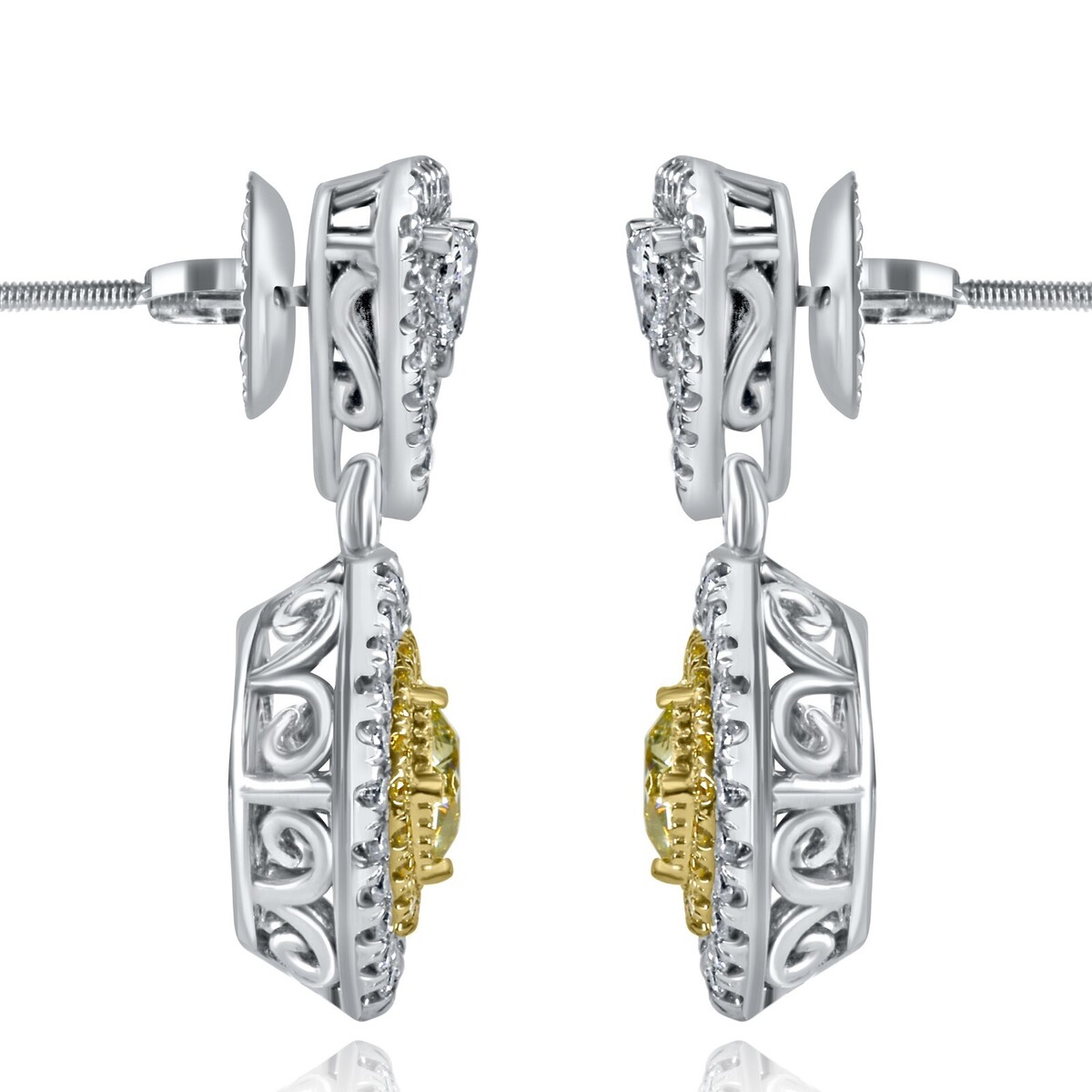 Handcrafted in 14k two-tone gold, these earrings feature 0.64 carat cushion brilliant cut natural fancy yellow diamonds in double halo of yellow and colorless round cut diamonds in pave setting w/ 0.20 carat 2 trillion I color SI clarity diamonds on the sides, attached to screw back closure by round cut colorless diamonds. These stunning teardrop diamond earrings are perfect for your wedding day or special occasion!!!