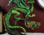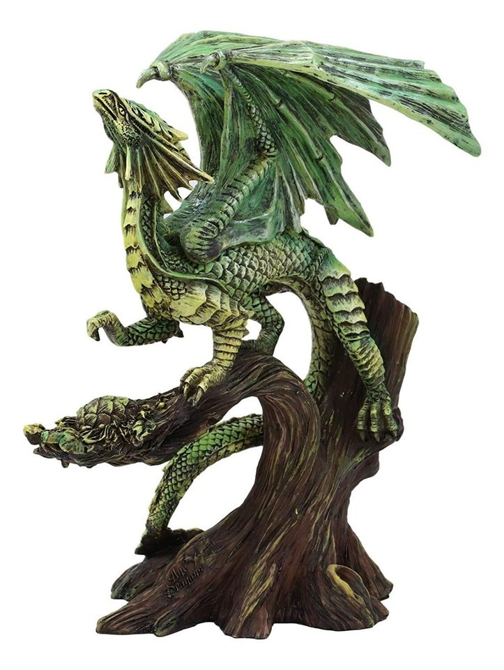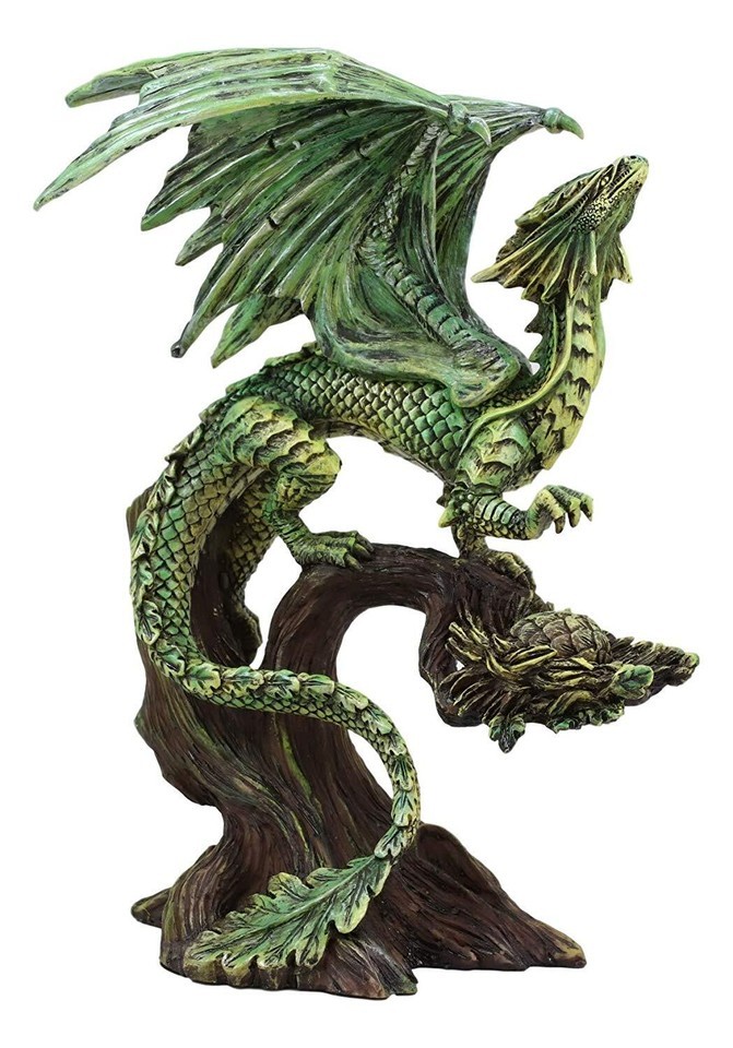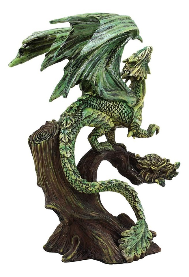? Just look at this tree dragon! This figurine has a green drake perched upon a curving branch. The ferocious beast has scales done in vibrant shades of emerald, wings held above his head and tail ending in a leaf, creating an uncanny camouflage. A unique and stunning addition to your fantasy collection!