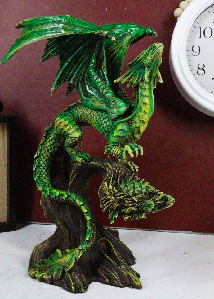 ? This Ent Tree Green Dragon Statue is made of designer composite resin, hand painted and polished individually. Color Tone may vary slightly from pictures.