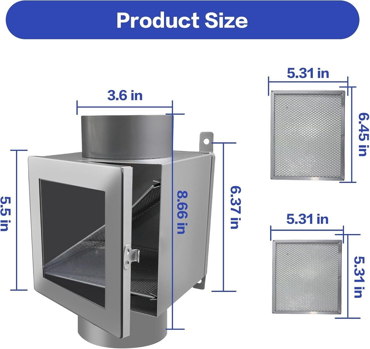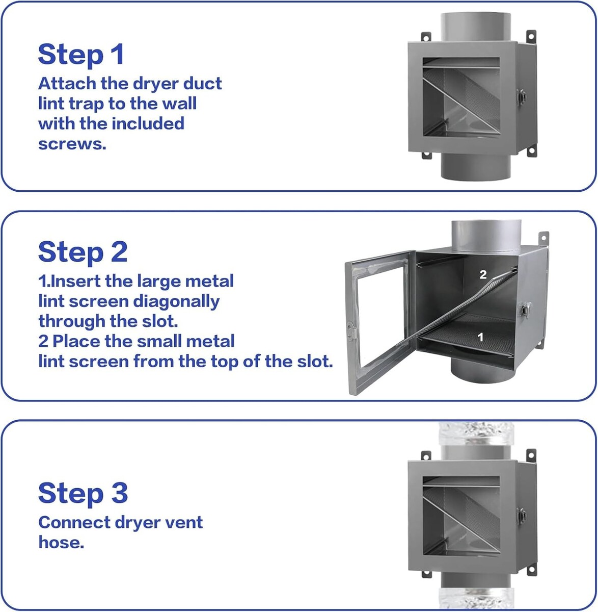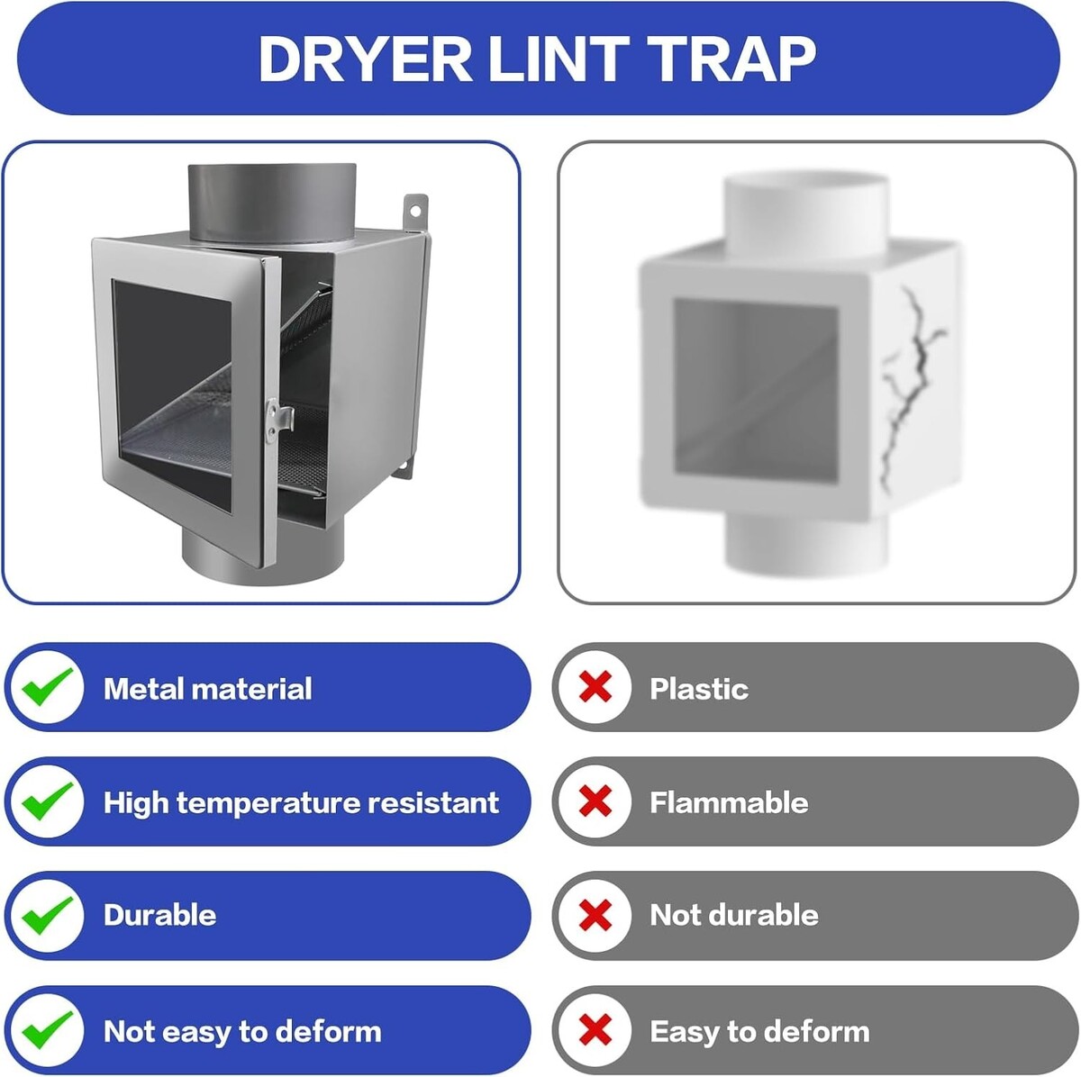 : The lint trap for dryer vent features a sturdy metal material, Have offers superior durability and rust resistance, It withstands high temperatures and able to resist wear and tear in long-term use, and used for a long time without deformation or damage.