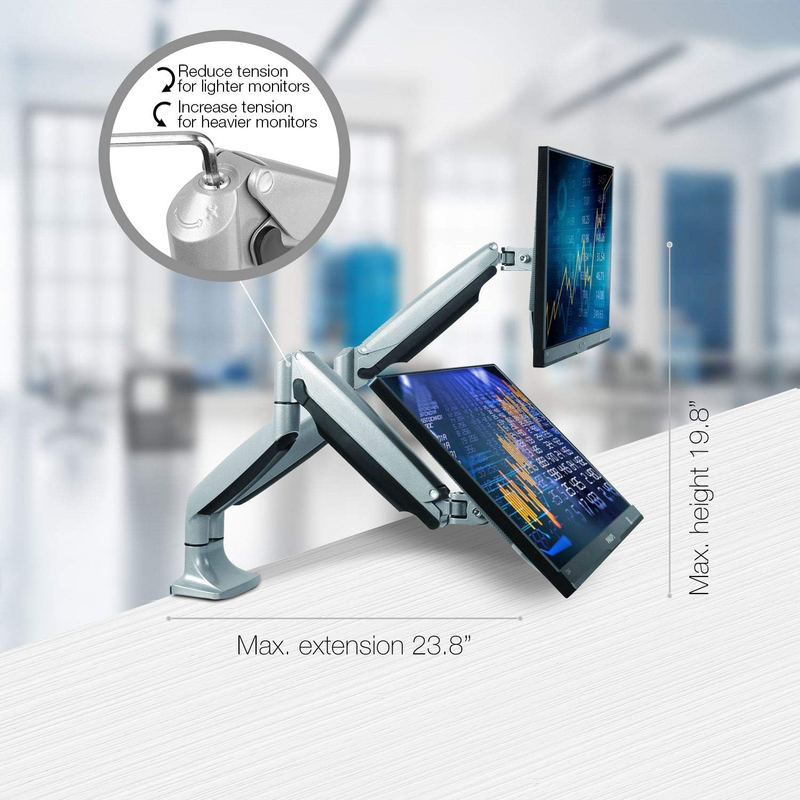 Strong Support: Designed with premium, articulating gas springs and heavy-duty aluminum, our computer monitor stand for desk spaces can hold nearly 20lbs per self-balancing arm.