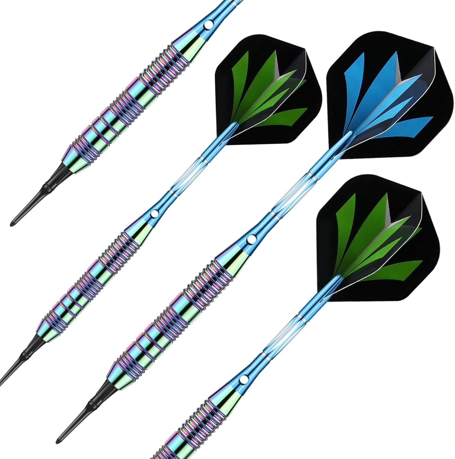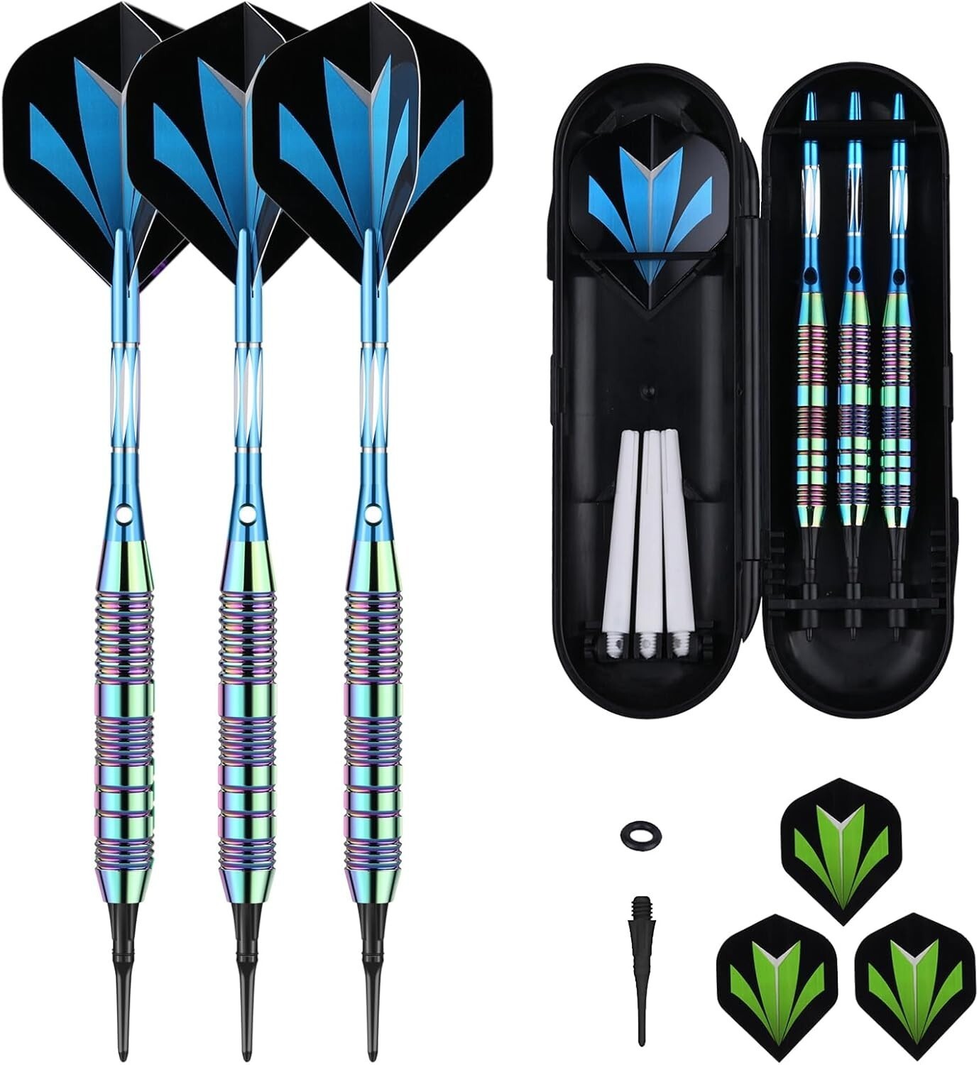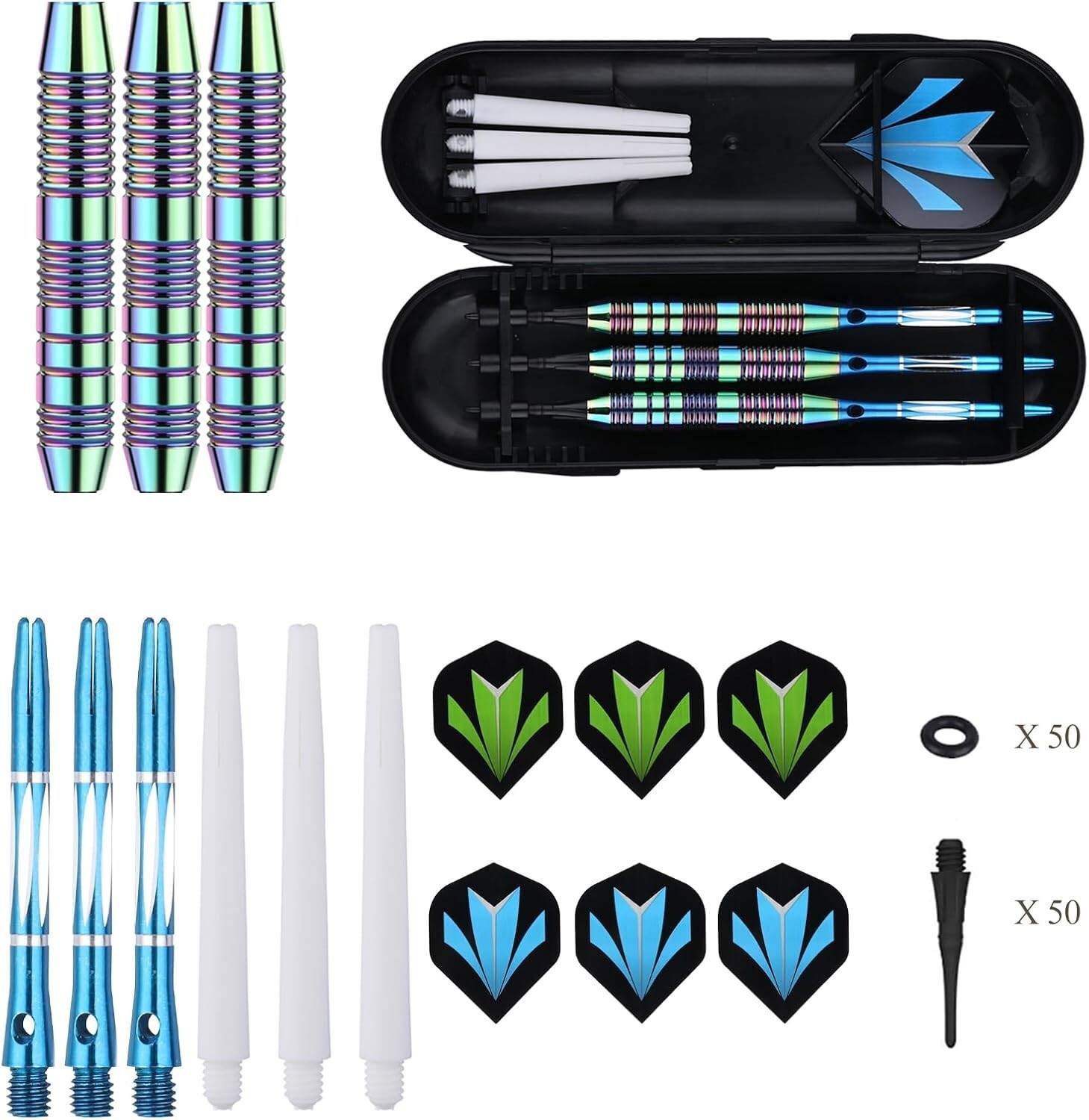 Experience the perfect blend of style, precision, and durability with our unique Rainbow+Blue Barrel Darts Set. Crafted with high-quality, slim-profile barrels featuring deep grooves and shark-cut rings for an excellent grip and consistent hand placement. Each dart is equipped with unbreakable aluminum shafts with locking holes, ensuring stability and reducing the need for retightening. Designed for electronic dartboards, the set includes 50 soft tips, 6 flights, 3 nylon shafts, and 50 rubber O-rings, making it an ideal gift for darts enthusiasts. Elevate your game and create lasting memories with this comprehensive, durable set.