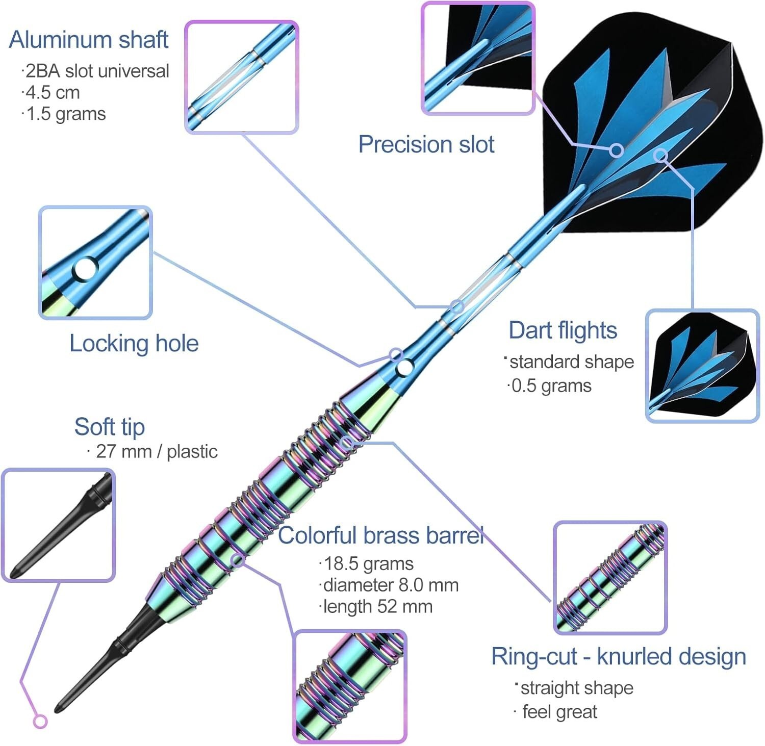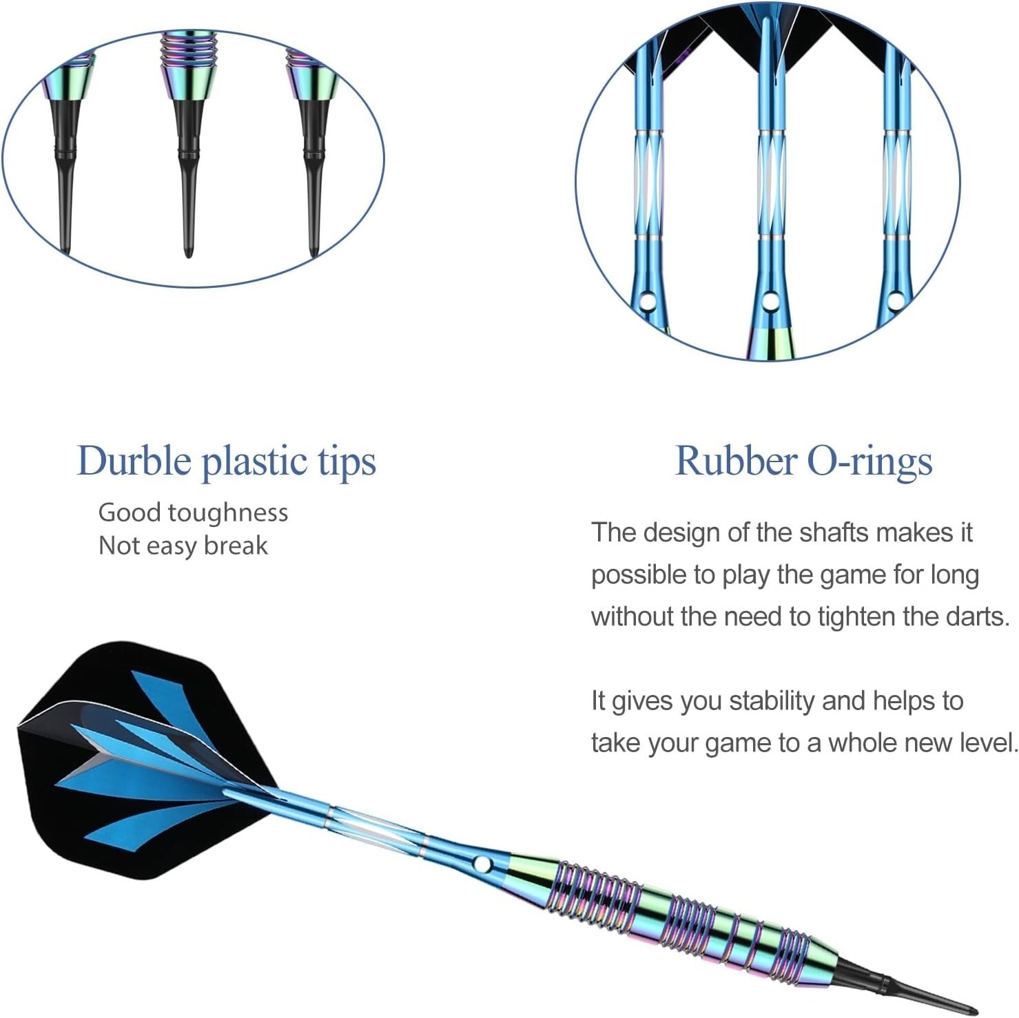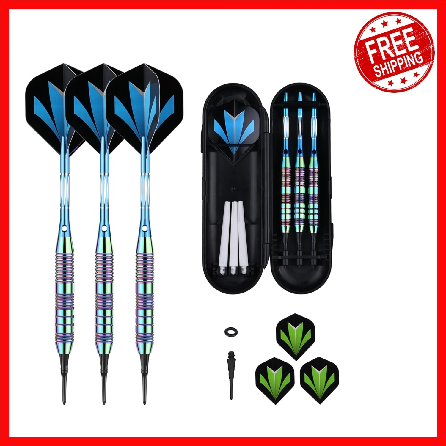 Experience the perfect blend of style, precision, and durability with our unique Rainbow+Blue Barrel Darts Set. Crafted with high-quality, slim-profile barrels featuring deep grooves and shark-cut rings for an excellent grip and consistent hand placement. Each dart is equipped with unbreakable aluminum shafts with locking holes, ensuring stability and reducing the need for retightening. Designed for electronic dartboards, the set includes 50 soft tips, 6 flights, 3 nylon shafts, and 50 rubber O-rings, making it an ideal gift for darts enthusiasts. Elevate your game and create lasting memories with this comprehensive, durable set.
