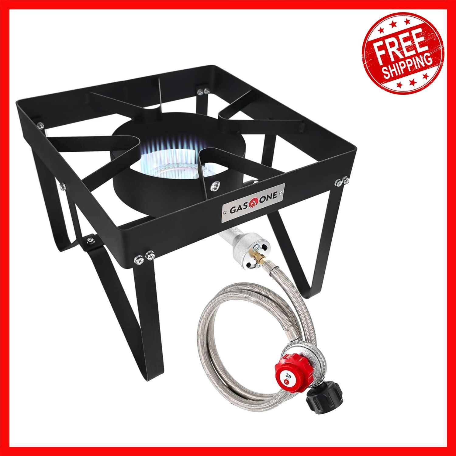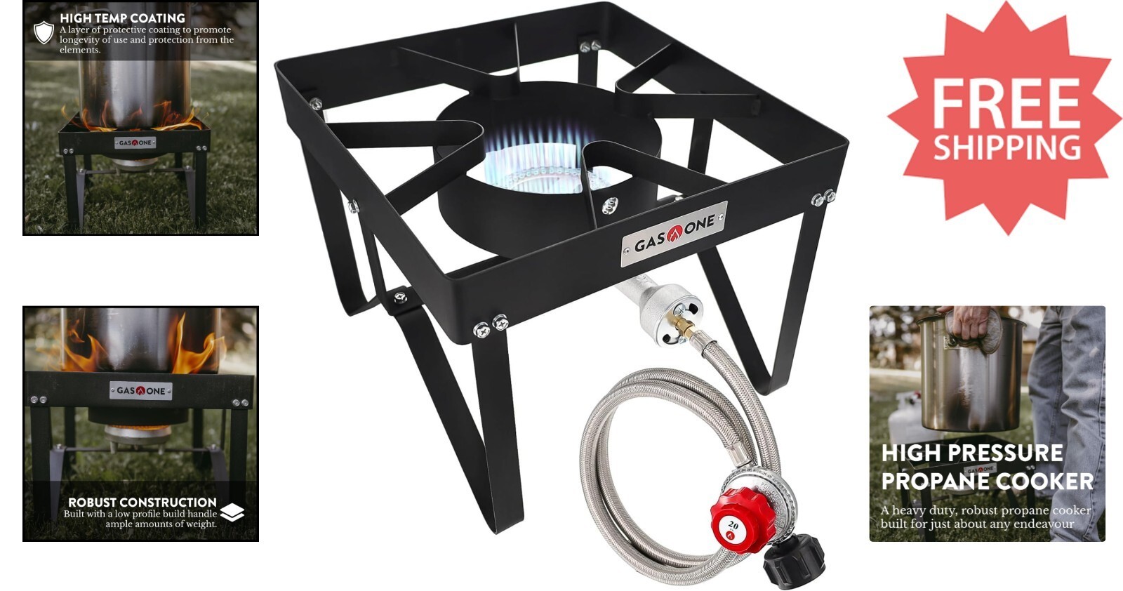 Experience the versatility of the Gas One High Heat Outdoor Cooker, designed for quick and efficient outdoor cooking. Equipped with a robust, sturdy frame and a heat-resistant steel-braided hose with a high-pressure adjustable regulator, this single propane burner ensures safe and reliable operation. Perfect for tailgating, camping, or family cookouts, it excels at frying, boiling, and grilling. Whether you're preparing a turkey, crab boil, or Cajun dish, this reliable cooker will meet all your outdoor culinary needs.