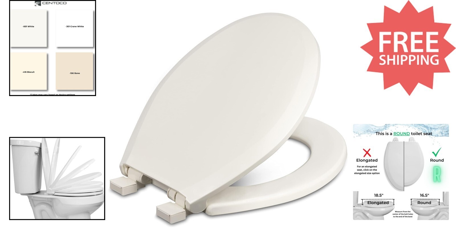 Experience the perfect blend of safety, comfort, and style with the Centoco 3700SC Deluxe Plastic Toilet Seat. Featuring a Slow Close mechanism, it ensures a quiet, gentle closure to prevent slamming, safeguarding children and pets. Crafted from high-quality, impact-resistant, and color-matched plastic, this seat is designed for durability and aesthetic appeal. Its impact-absorbing hinges and corrosion-free hardware provide stability and security, while the high-gloss, non-porous finish makes cleaning effortless and resists staining and discoloration. Easy to install with straightforward instructions, it fits all standard round toilets from major brands like Kohler, American Standard, and TOTO. Proudly made in the USA, this toilet seat combines functionality with a sleek look to enhance any bathroom decor.