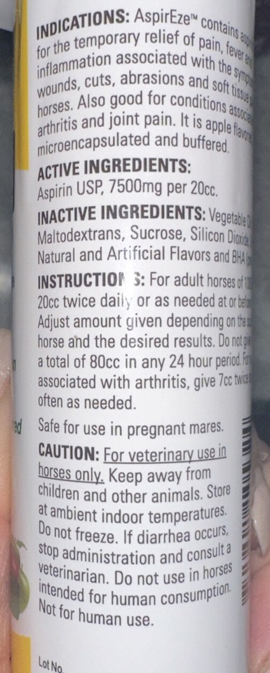 Our AspirEze Aspirin Gel is designed to support your horse's health and wellbeing. It contains microencapsulated aspirin, which is gentler on the stomach than traditional aspirin. This gel is easy to administer and can be given orally or mixed with your horse's feed. It is perfect for horses that are involved in sporting activities, as well as those that suffer from arthritis or other joint-related conditions. ShipN24Hours. Inventory Location 7827