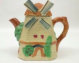 EUC, Excellent Used Condition vintage Dutch Windmill porcelain teapot made in Japan. The teapot's body is a windmill. Made in Japan stamped on the bottom. Made between 1921-1941. The windmill house has windows, a door and green bushes. The spout and handle are a tree branch. The windmill blades are placed two on the body of the teapot and two on are on the roof top. There is a vent hole in the back of the roof.