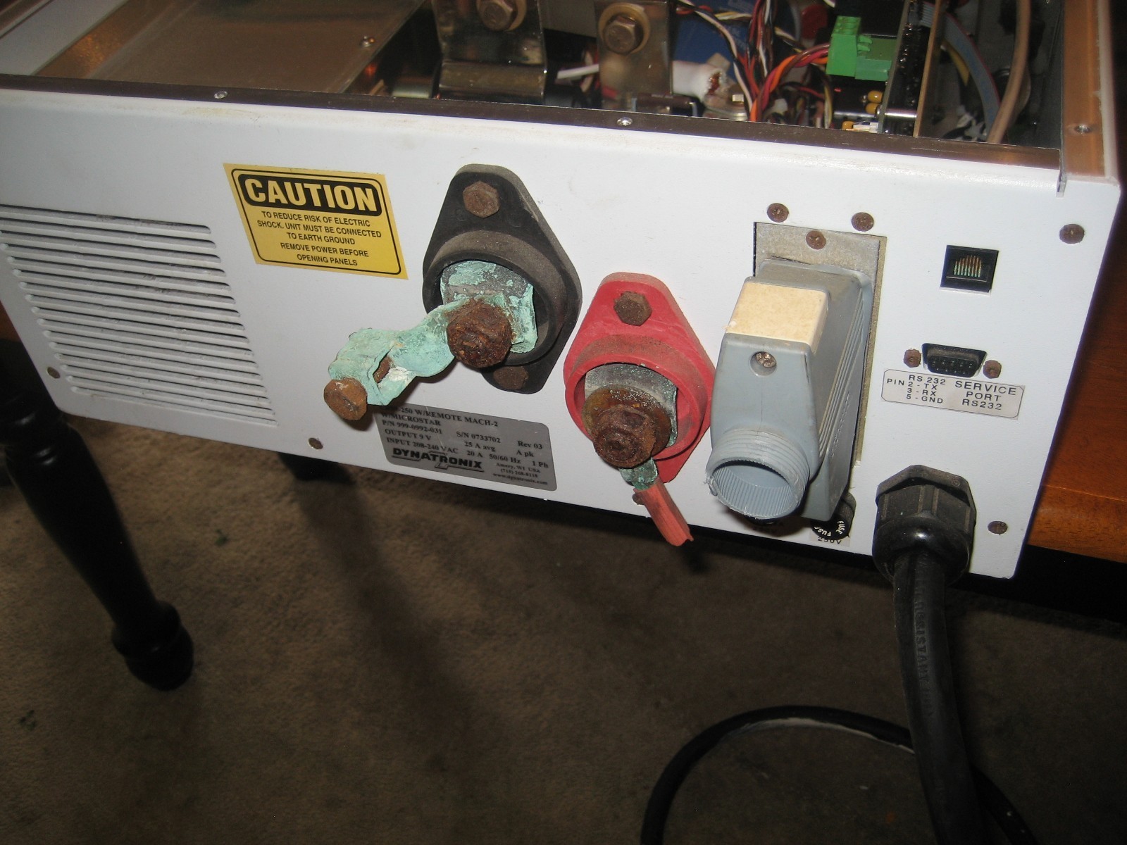 Dynatronix CRS9-250 Power Supply with Remote Mach 2 Microstar Output: 9v DC - 25A avg Input: 208-240VAC - 20A Got this from a government lab. The inner workings of this unit look pristine, but the 3 terminals/connectors at the rear need to be replaced/repaired. Two are rusty and one is damaged. Please look at all pictures. This should work once the terminals are fixed in the back. YOu can get a deal on this baby. Do not know the story of why the terminals are rusted. Will ship international - we get excellent international rates through DHL - please contact me for a quote..