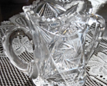 This small clear glass vase packs a pretty punch. There is a defined sawtooth edge on the top. The double handles are thick and strong. Patterns visible are hobstar, buzzsaw, and pinwheel. Even the base has a pattern. This vase has no found rough edges or chips. It is very heavy. Measures 4.5" tall X 6" wide (includes handles) X 3.25" diam mouth and base.