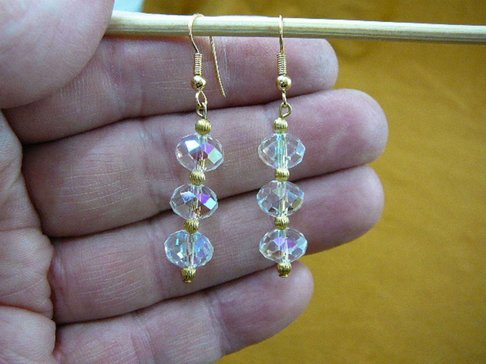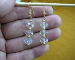 (Internal #EE-503-112) This is a beautiful pair of three bead, faceted 10x8 mm, iridescent clear white Austrian crystal dangle earrings with gold tone bead accents, on gold tone hypoallergenic French wires.