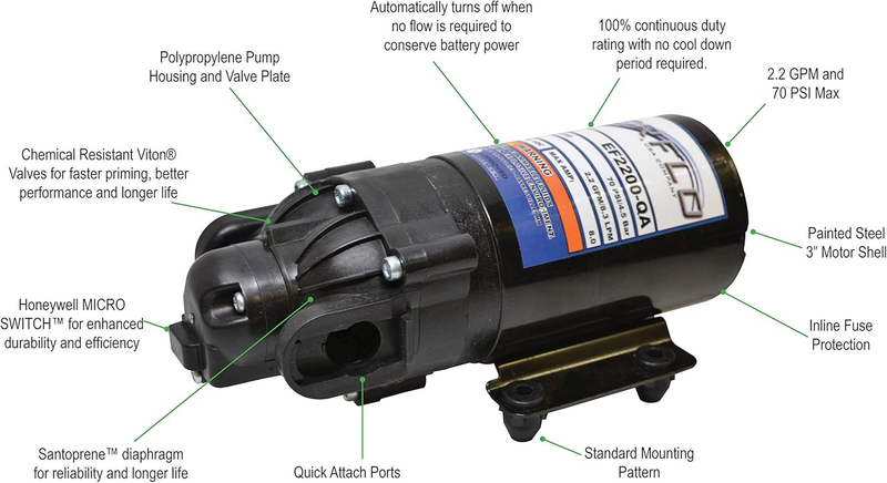 Pump Features: When it comes to fluid transfer applications, the Everflo 12V On-Demand 2.2GPM Quick Attach Diaphragm Pump is the king of the hill. This pump is loaded with features such as a Honeywell Micro Switch?, corrosion resistant Viton valves Santoprene? diaphragm, fiberglass-reinforced polypropylene pump manifold with quick attach ports. Other features include a silky smooth valve design for faster primes a unique pressure switch that slowly cycles the pump to reduce wear on the motor switch. Save battery power with the automatic power switch that turns off pump when no flow is needed. CE approved has standard mounting pattern for quick installation. Backed by two-year warranty