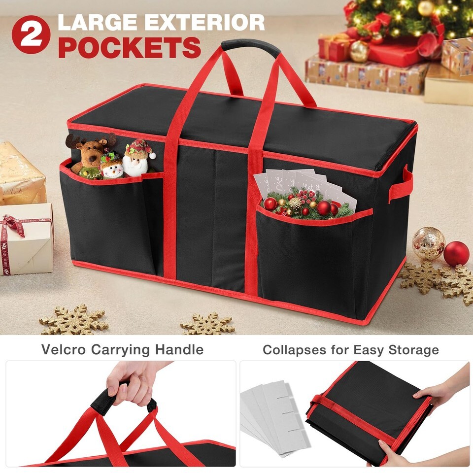 Convenient Design:The large storage box feature with 2 pockets, provide extra space to keep other items, such as statue ornaments, wreath, garland, gnomes decor, and so on. This Christmas decor storage is designed for convenient to use. Its lightweight yet sturdy structure makes it simple to store and retrieve, provide various holiday decoration experience.