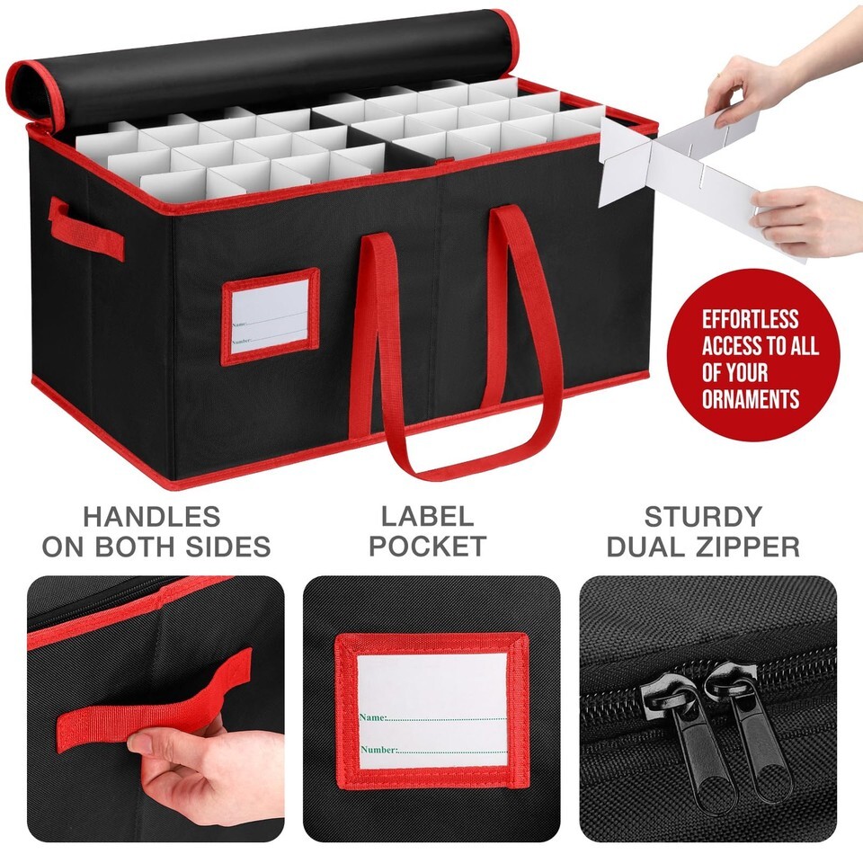 Sturdy Material: This Christmas ornament holder set is crafted with high-quality, sturdy tear-proof and waterproof 600D oxford fabric and double zipper lid, the ornament organizer storage box is designed to protect delicate ornaments from dust, moisture, and damage
