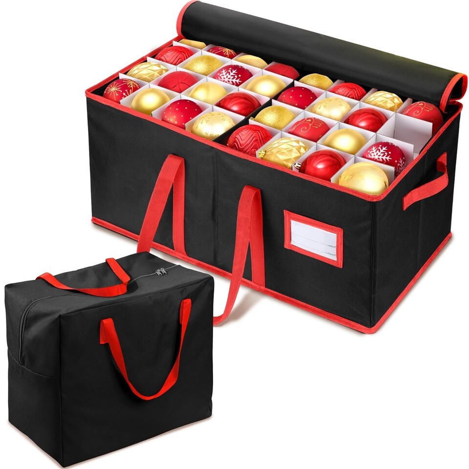 Packing Including: 1 Pack Christmas ornament storage box with zippers, adjustable dividers, and 3 trays with adjustable slots, neatly store up to 128 ornaments. And 1 Pack medium Christmas ornament storage bag can keep other items.The ornament organizer set is ideal for organized and protect your ornaments