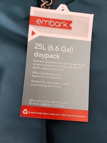 - EMBARK ~ Teal/Green ~ Daypack ~ 20 x 12 x 7 ~ 6.6 Gallon (25L) ~ Lightweight