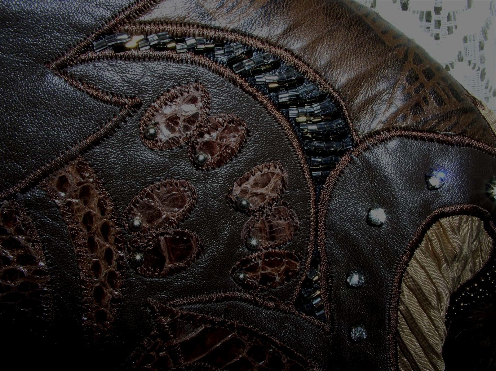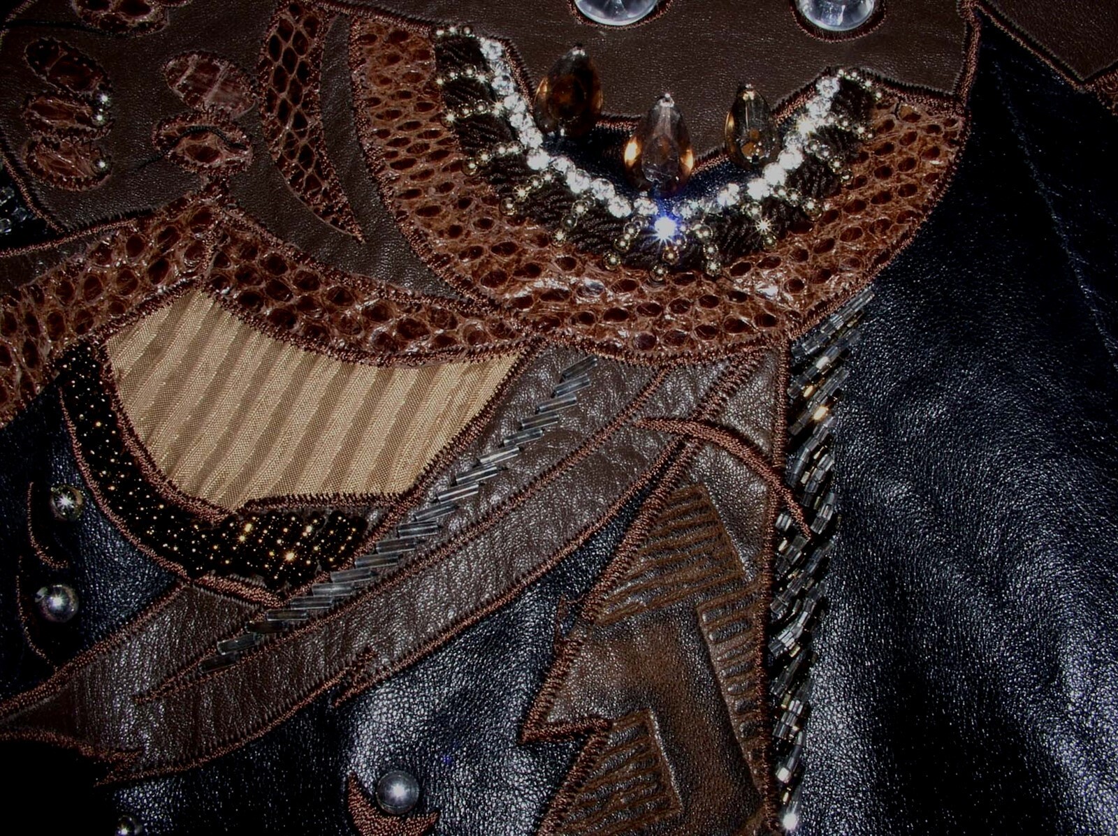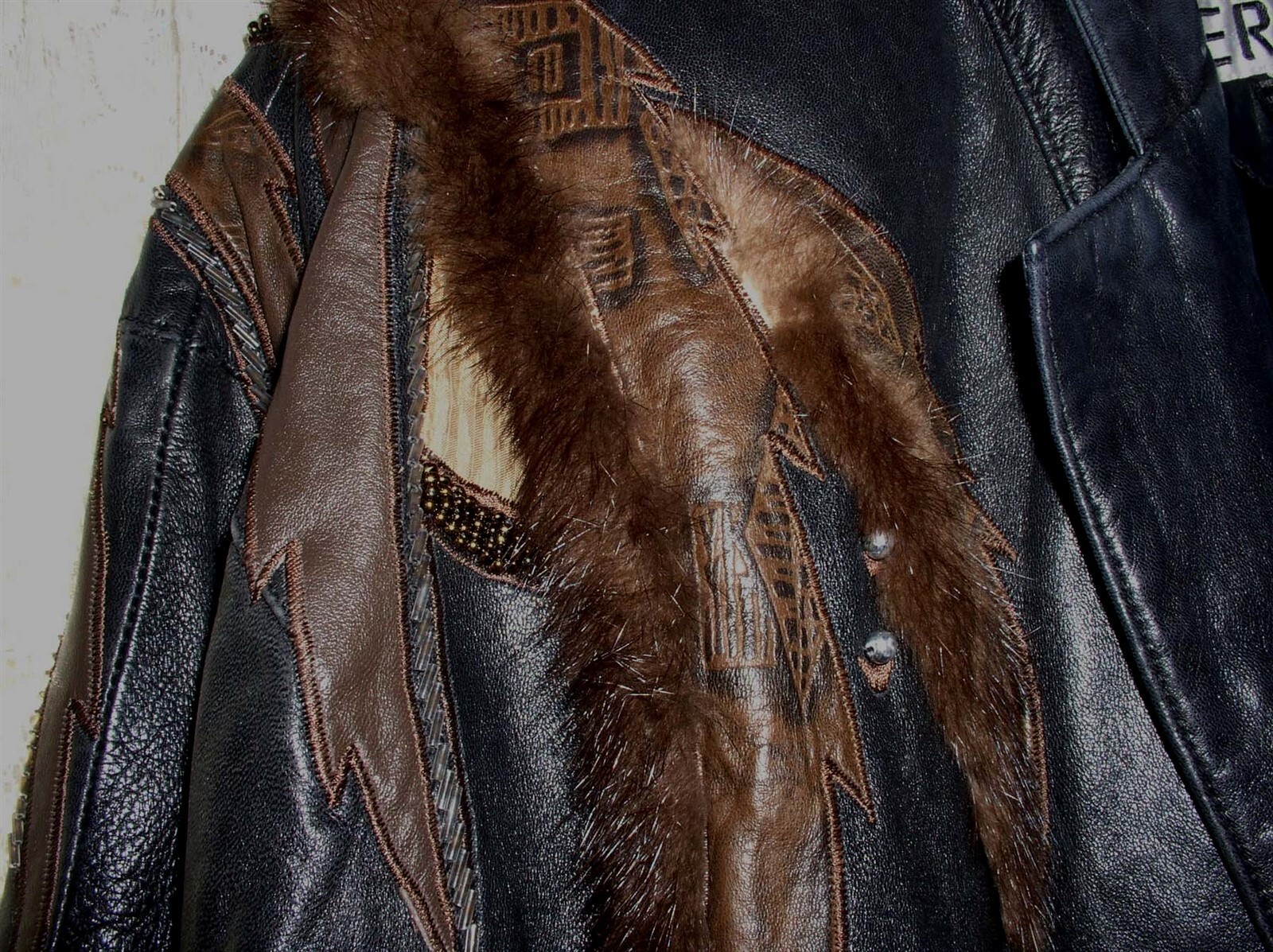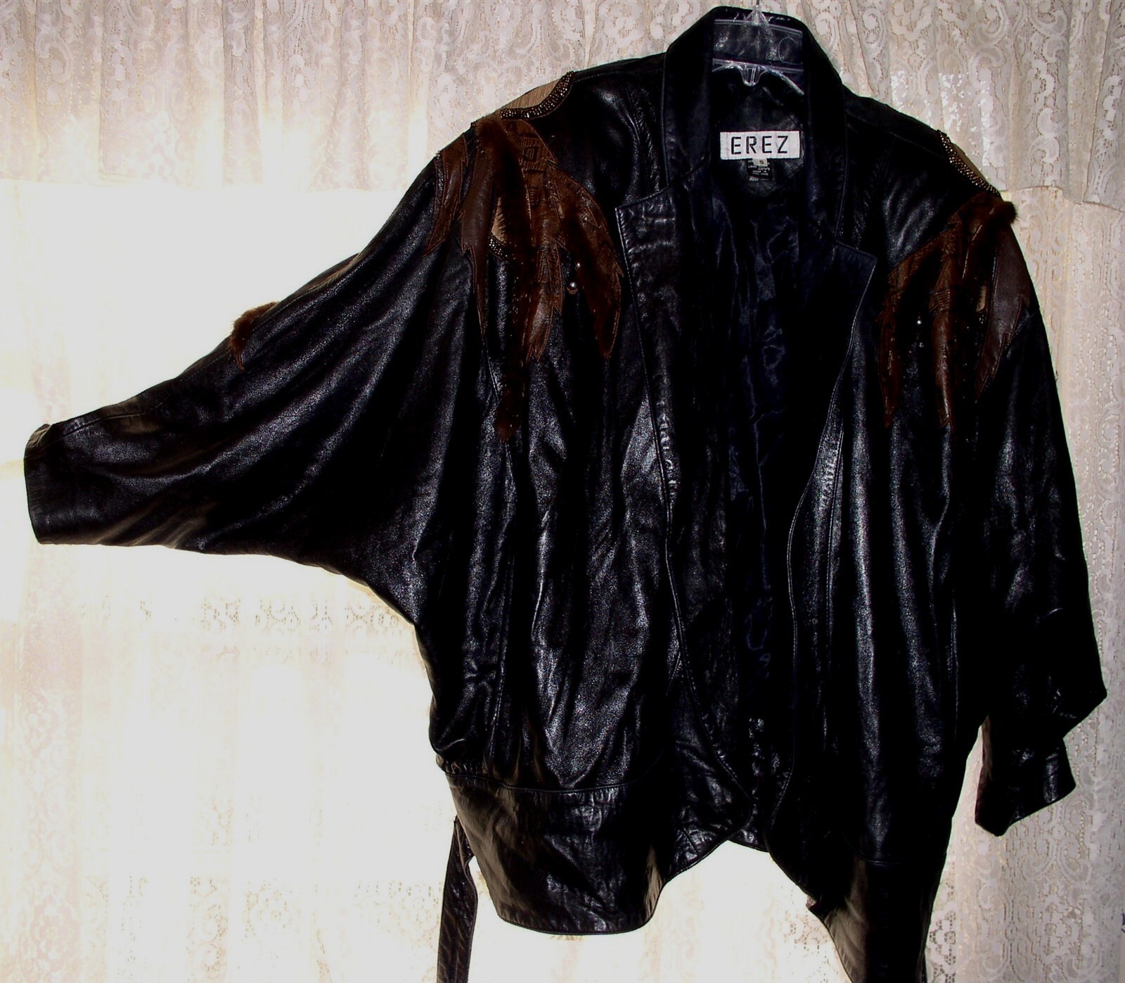 It has "bat wing" sleeves giving it a very "young" look. Padded shoulders and 2 front pockets. There is meticulous beading throughout, with fabric under carefully tooled leather for a very distinctive look. Bottom belt to hold it closed. The leather is "buttery" soft and supple. There are fur accents as well. I do not know if this is real or faux fur.