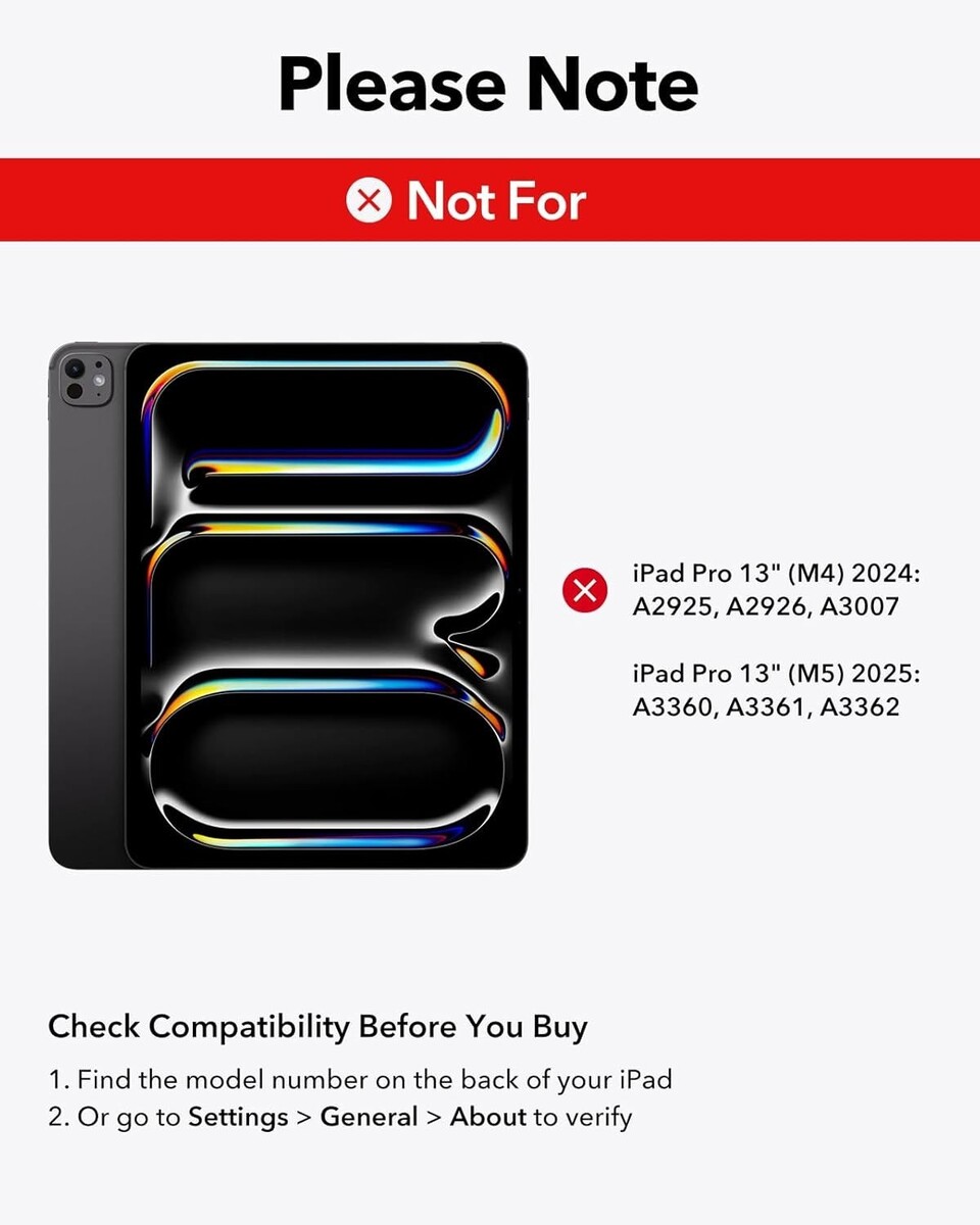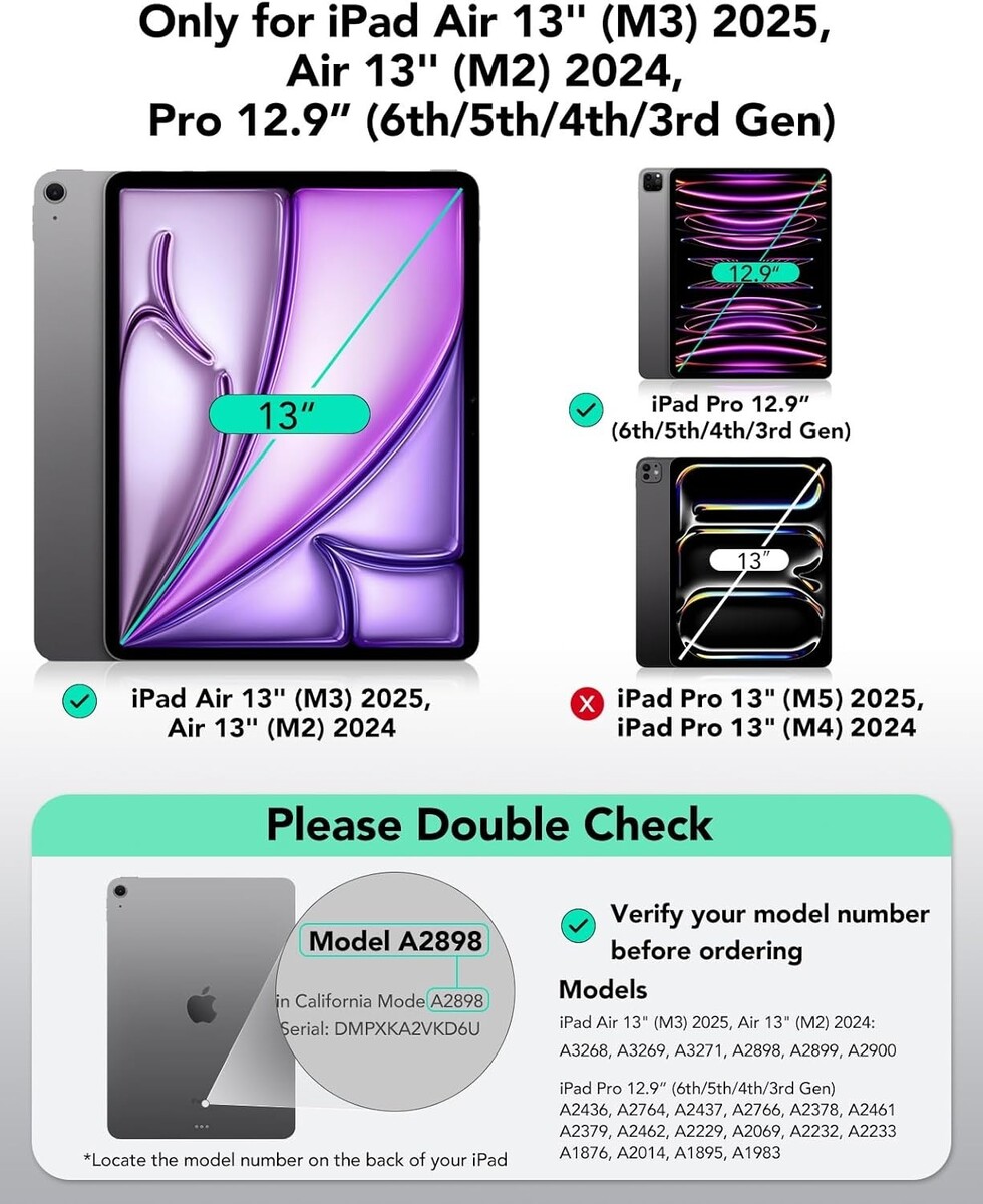 Compatibility: only compatible with iPad Air 13(M3/M2 2025/2024), iPad Pro 12.9 inch (2022/2021/2020/2018); models A2898? A2899?A2900?A3268?A3269?A3271?A2436?A2437?A2764?A2766?A2378?A2461?A2379?A2462?A2229?A2069?A2232?A2233?A1876?A2014?A1895?A1983