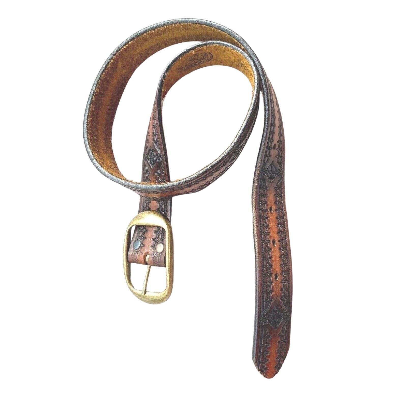 Eagle Leatherworks VTG Biker Belt Motorcycle Harley , marked Sz 32 and 30101 , from the 70s, Hand Tooled,in excellent condition, supple, usable. Belt is 36" long. The first hole is 3" from end, the last at 7" from end. 1 1/4" wide. Brass belt buckle snaps off.