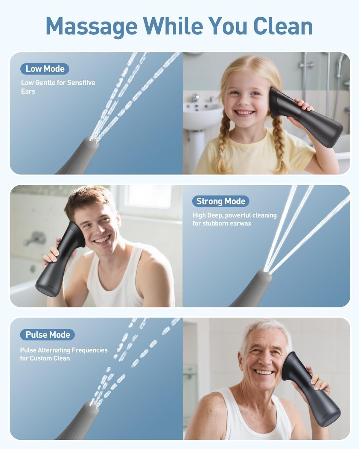 Tailored for Every Ear: Choose from 3 pressure settings ? Low, Pulse, and High ? to easily tackle daily cleaning or stubborn earwax buildup, itching, clogging, and relieve ear discomfort. The ear cleaner is suitable for kids too. Comes with 12 color-coded tips (1, 3, and 5-hole) providing up to 9 spray options for earwax removal. One device with personal pressure settings and tips for each family member keeps ears clean and healthy