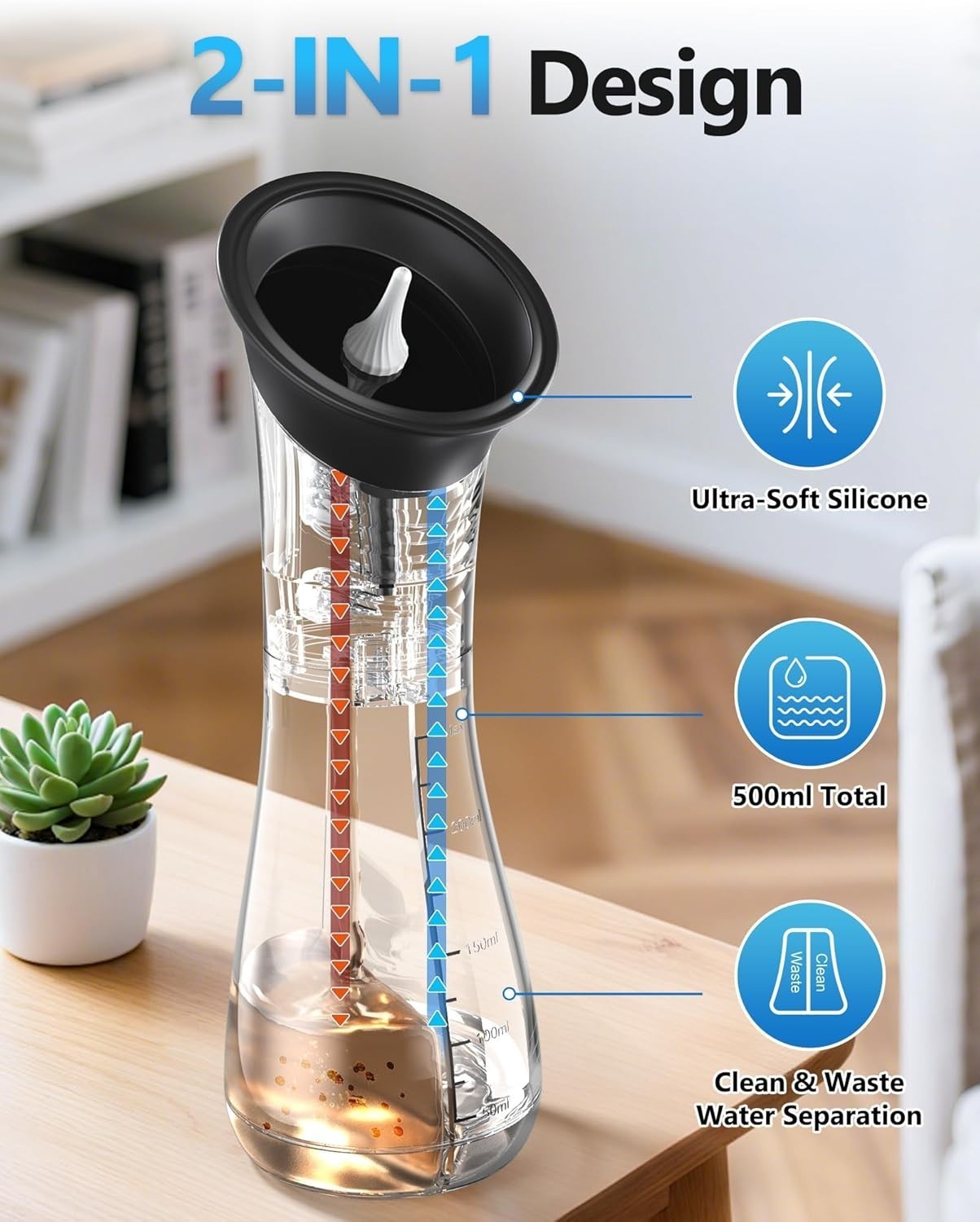 Easy to use: Integrated dual-tank design separates clean and dirty water, automatically returning wastewater to the dirty tank. Frees up your hands. Premium silicone ear cover fits all ears and prevents splashes. Extra-large 500ml total water tank for efficient ear wax removal with just one fill.
