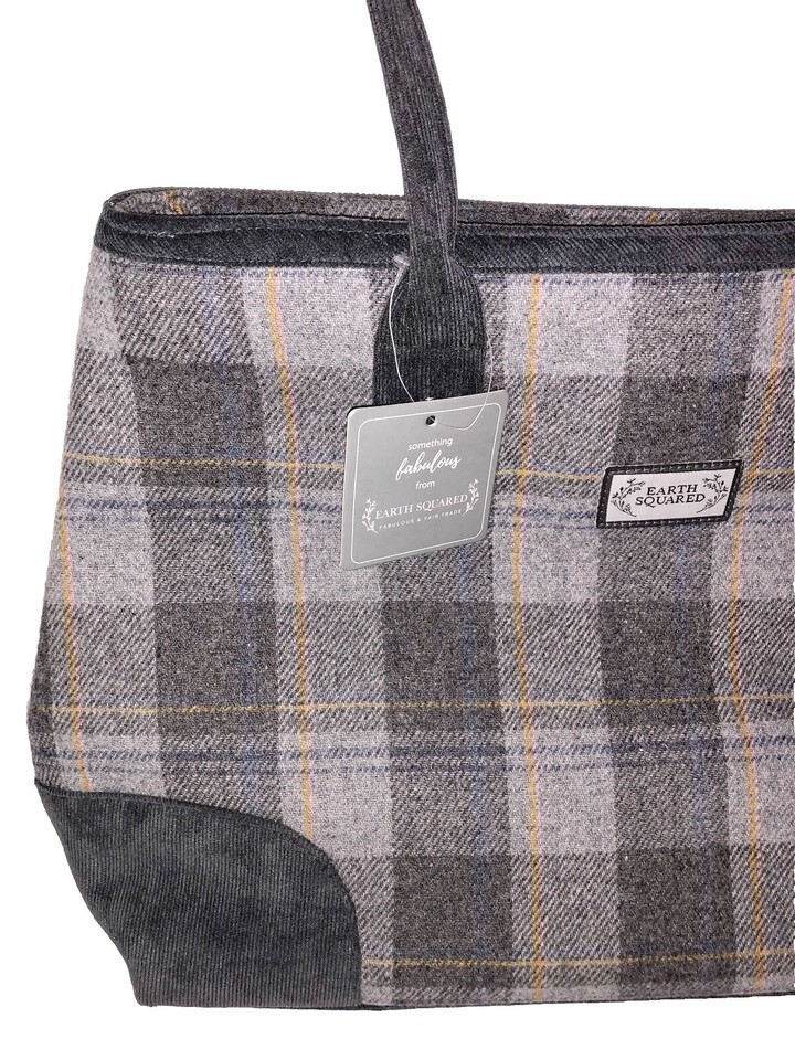 This is a medium-sized Earth Squared shoulder tote bag made of polyester and wool in a grey mustard plaid design. It features a zip closure, gray corduroy handles/straps, silver hardware, and a satin lining in gray. The bag has inner pockets, is lightweight, and suitable for travel, casual, workwear, or business occasions.