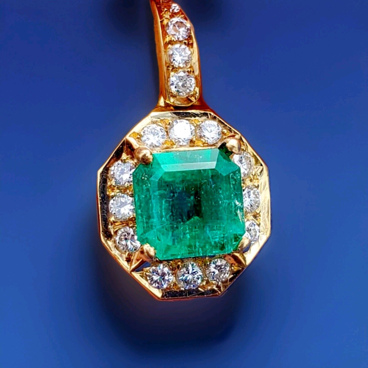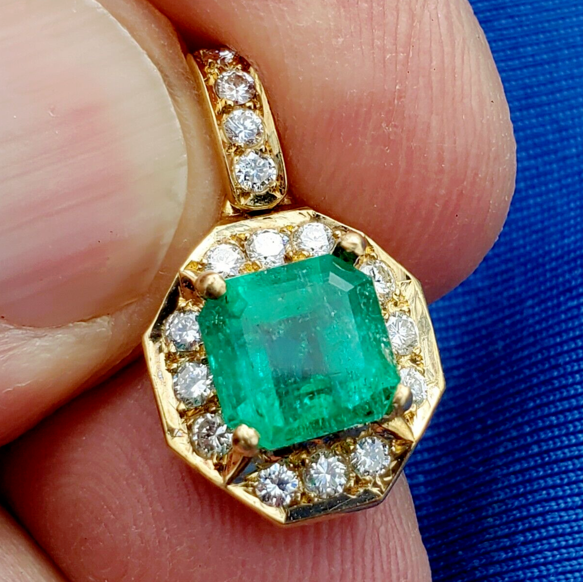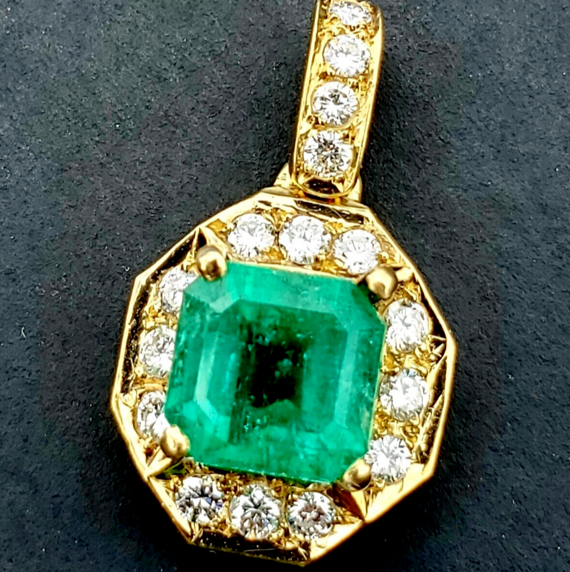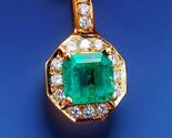 - Earth mined Colombian Emerald Diamond Pendant Deco Halo Solid 18k Gold Medallion