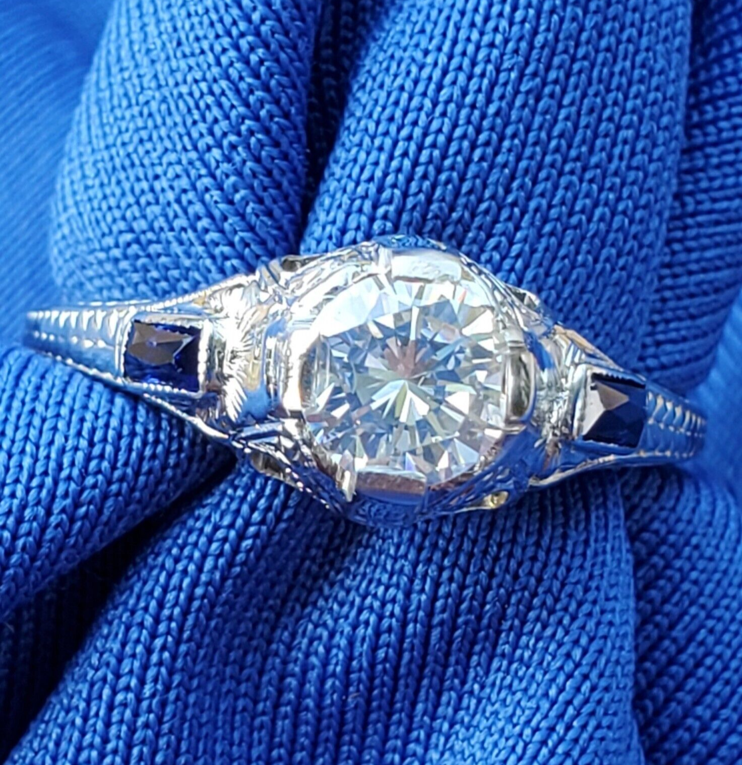 - Earth mined Diamond Deco Engagement Ring 0.72 ct Vintage Sapphire Solitaire 14k