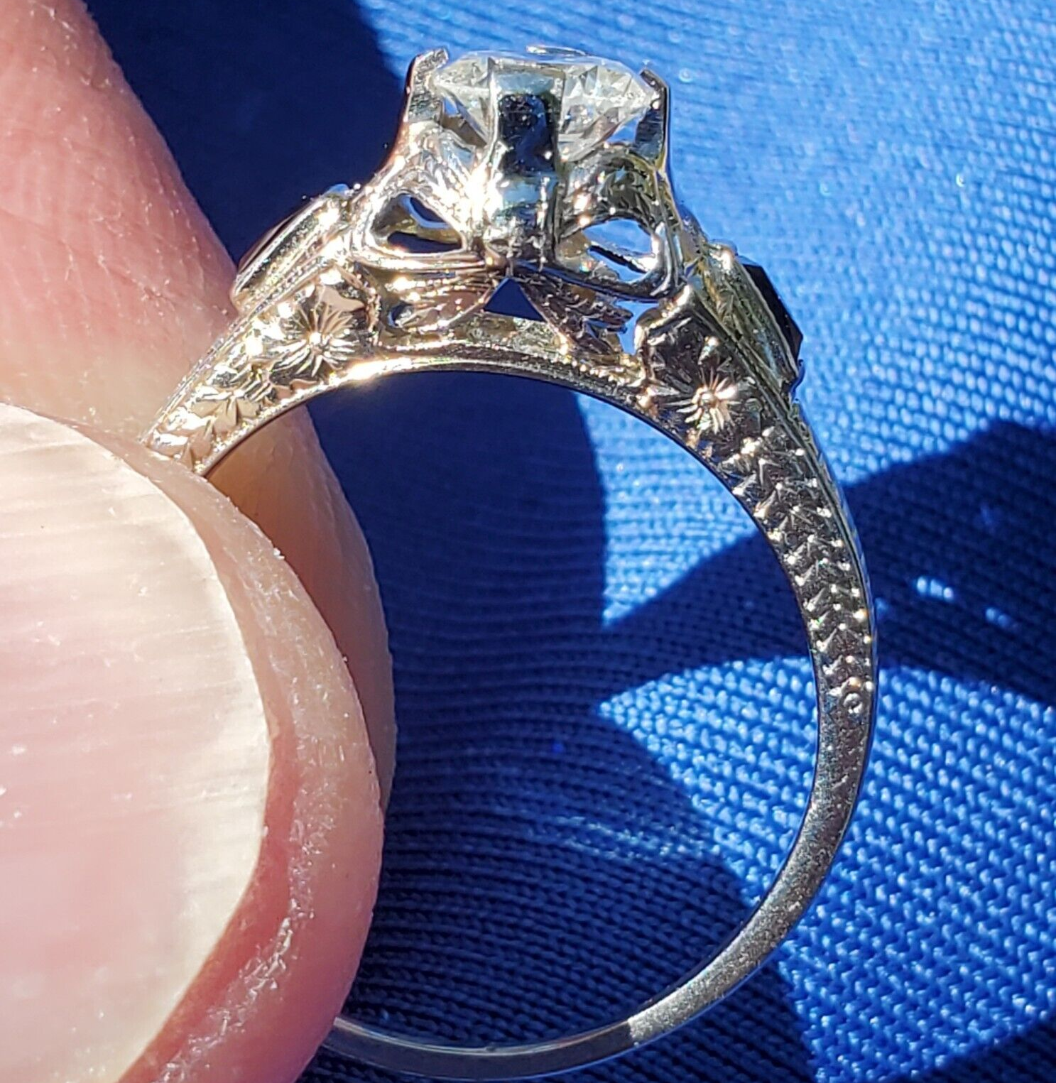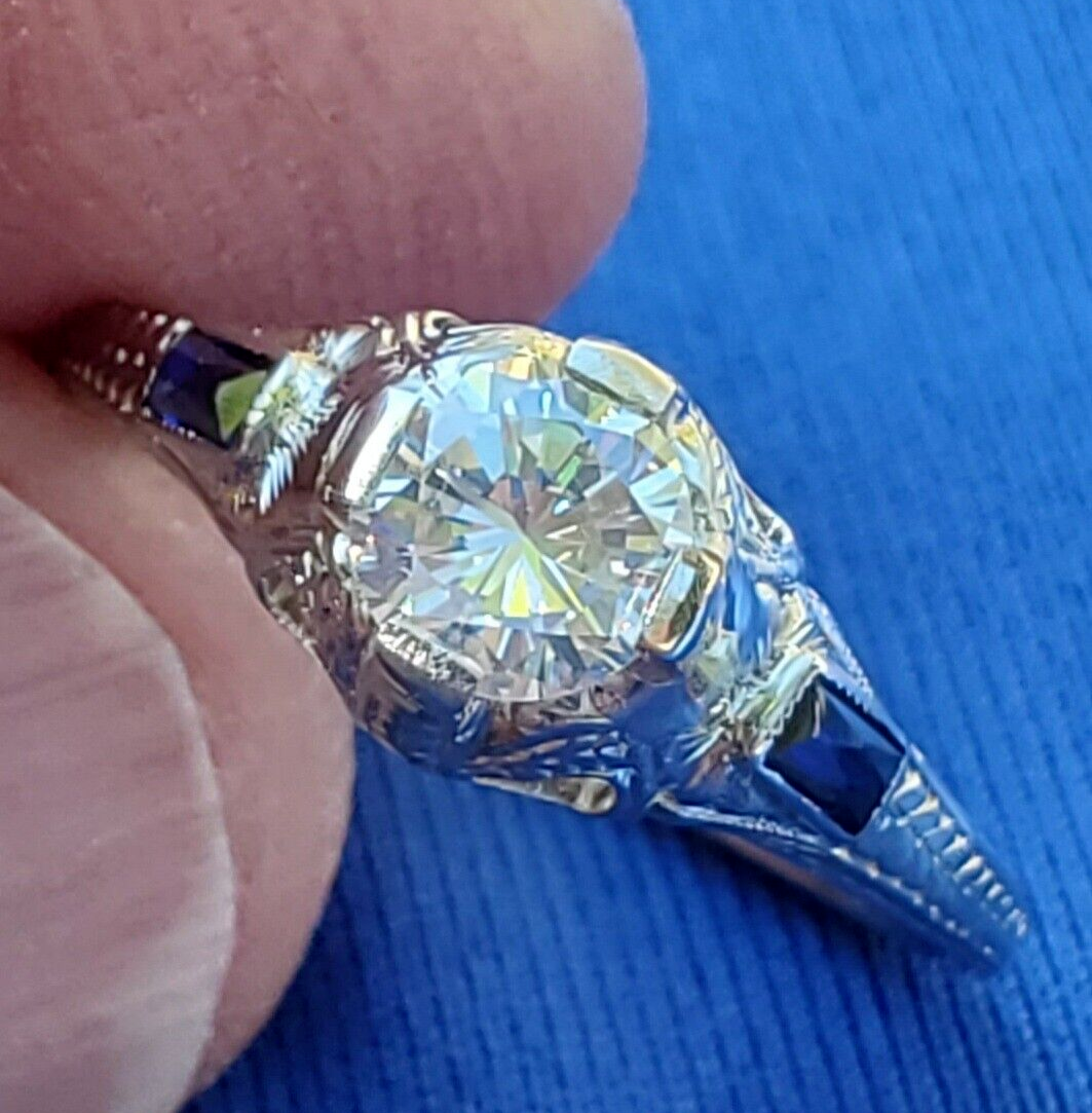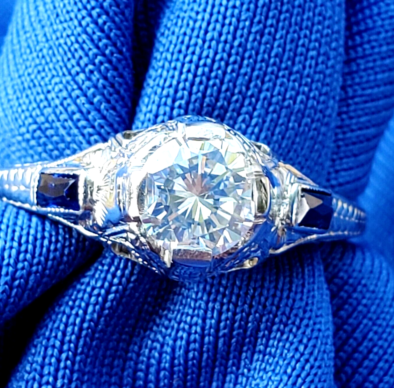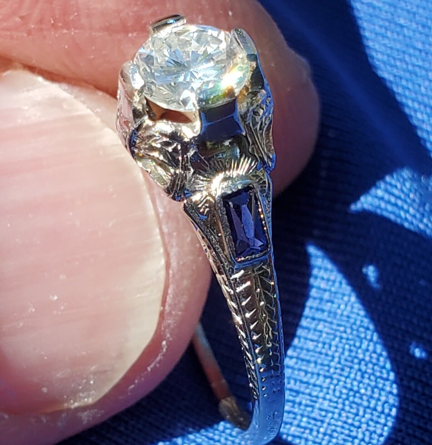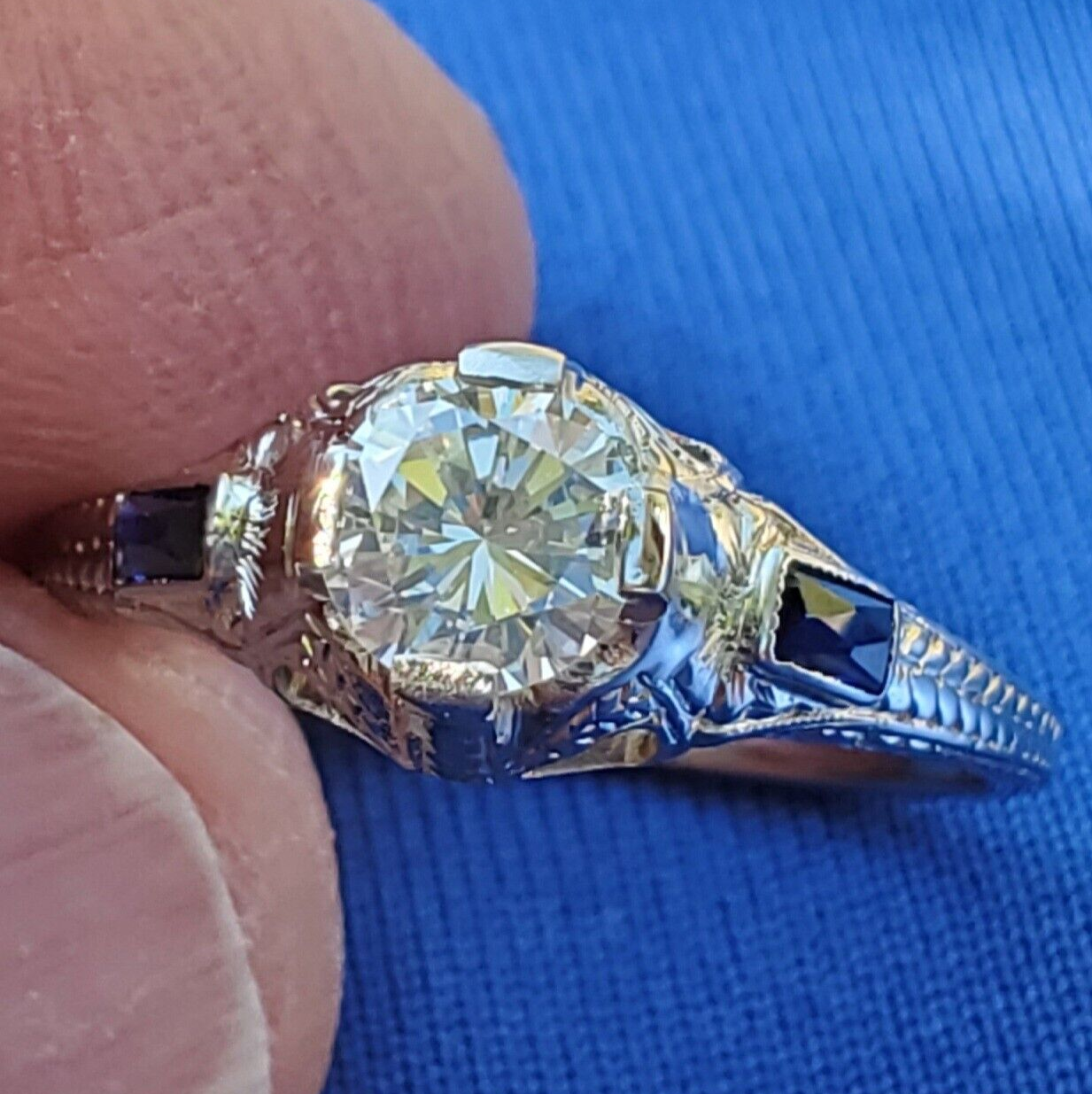 Earth mined Diamond Deco Engagement Ring 0.72 ct Vintage Sapphire Solitaire 14k