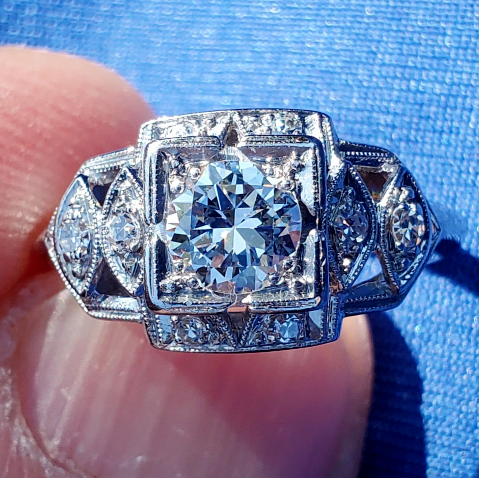 NATURAL EARTH-MINED DIAMOND PLATINUM DECO ENGAGEMENT STATEMENT RING.