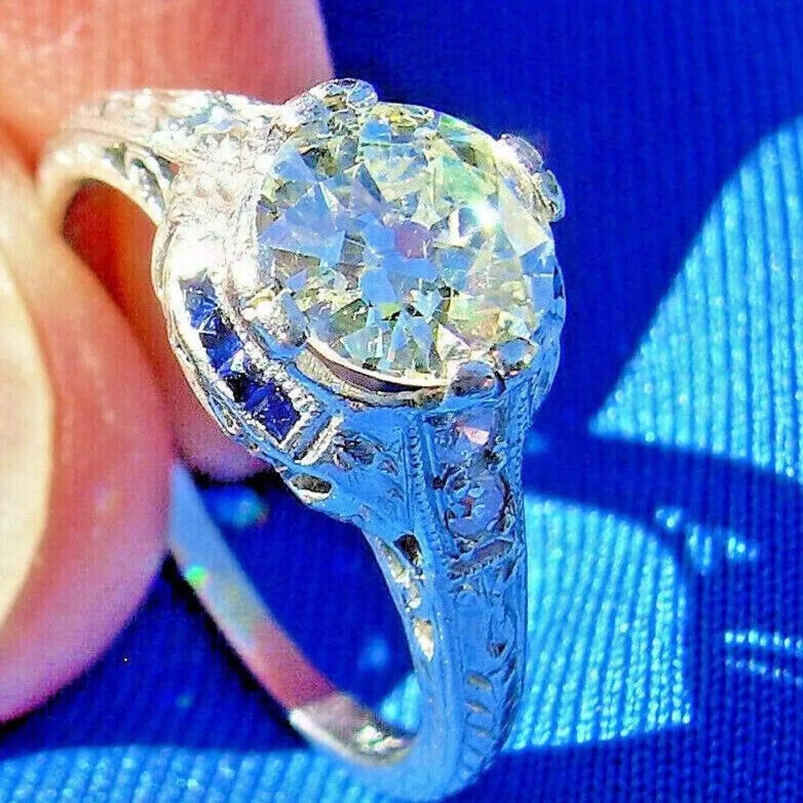 Earth mined Diamond Sapphire Art Deco Engagement Ring Vintage Platinum Statement