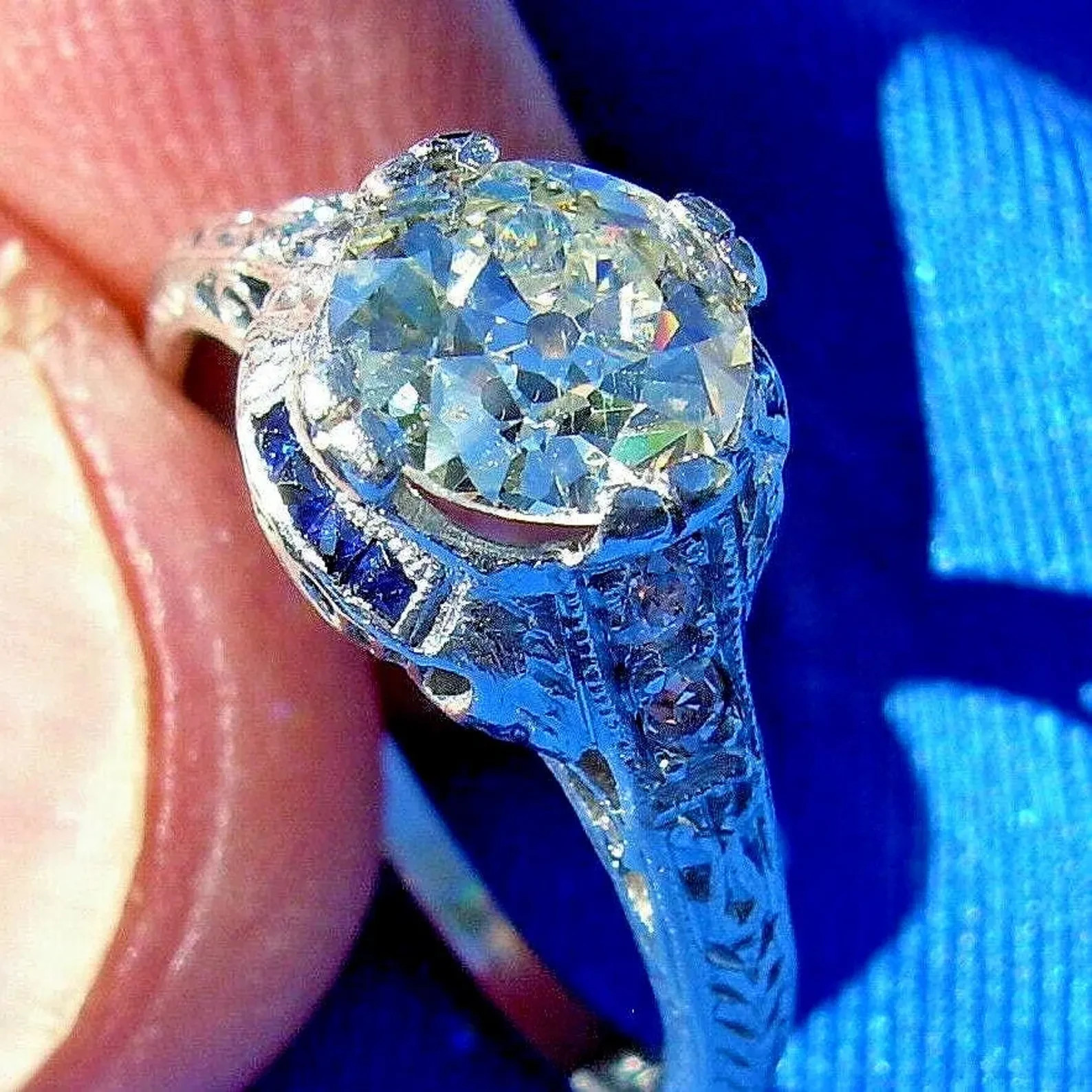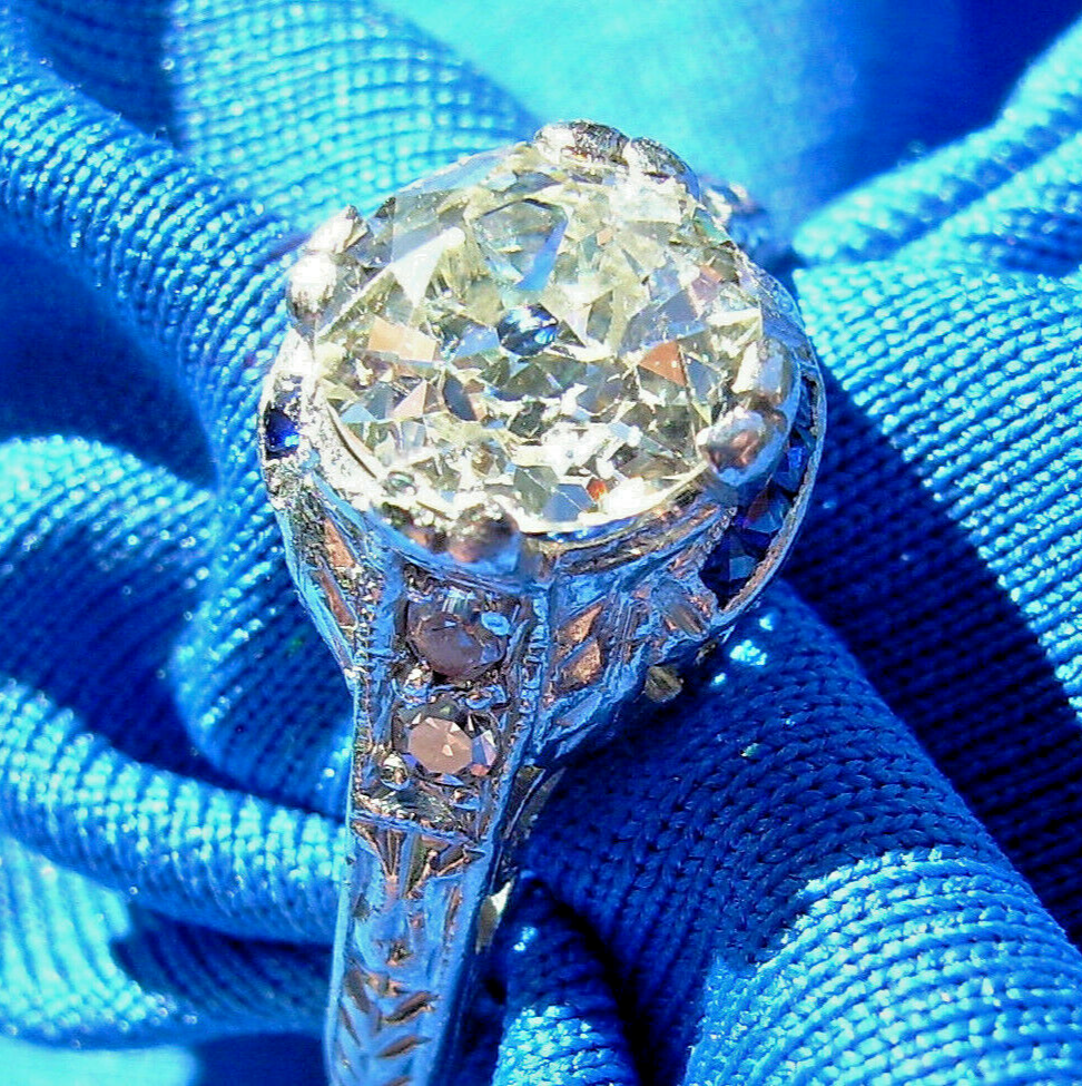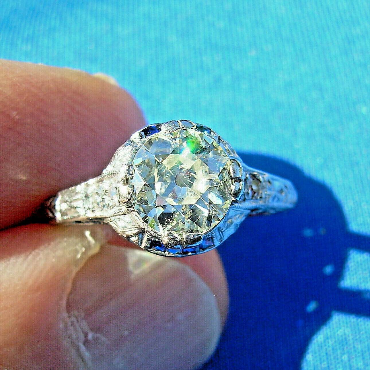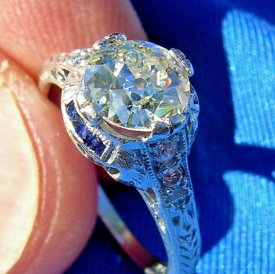 - Earth mined Diamond Sapphire Art Deco Engagement Ring Vintage Platinum Statement