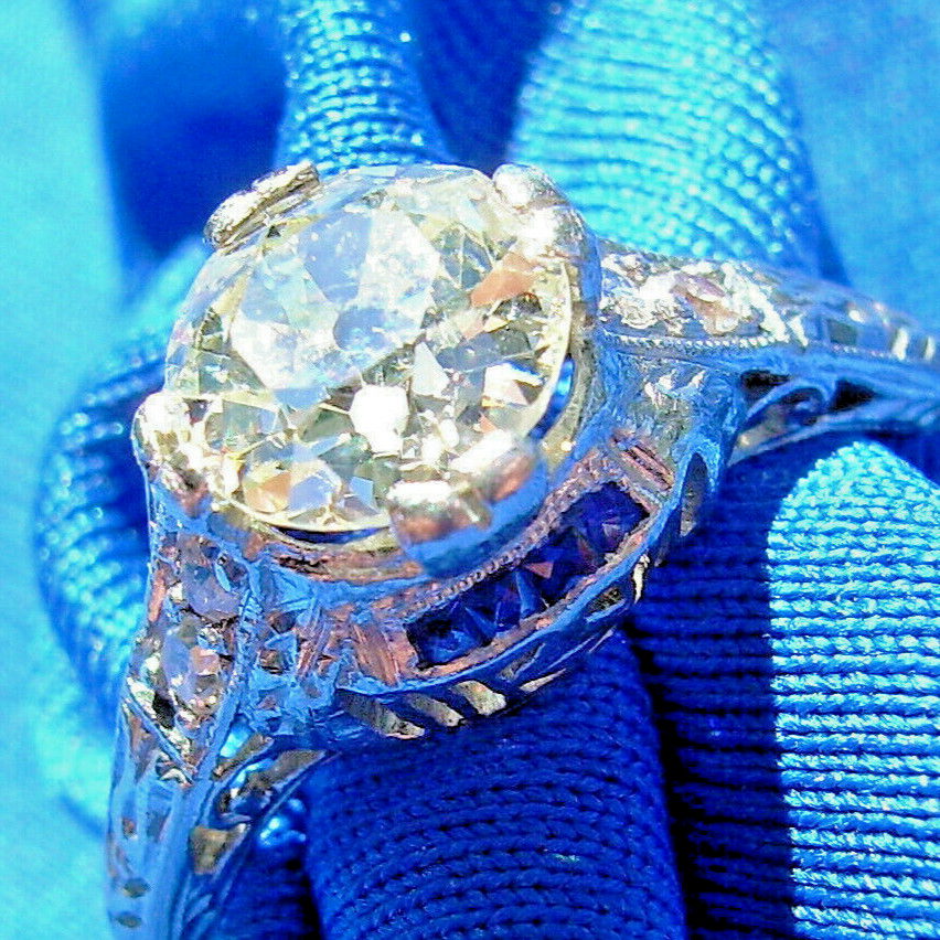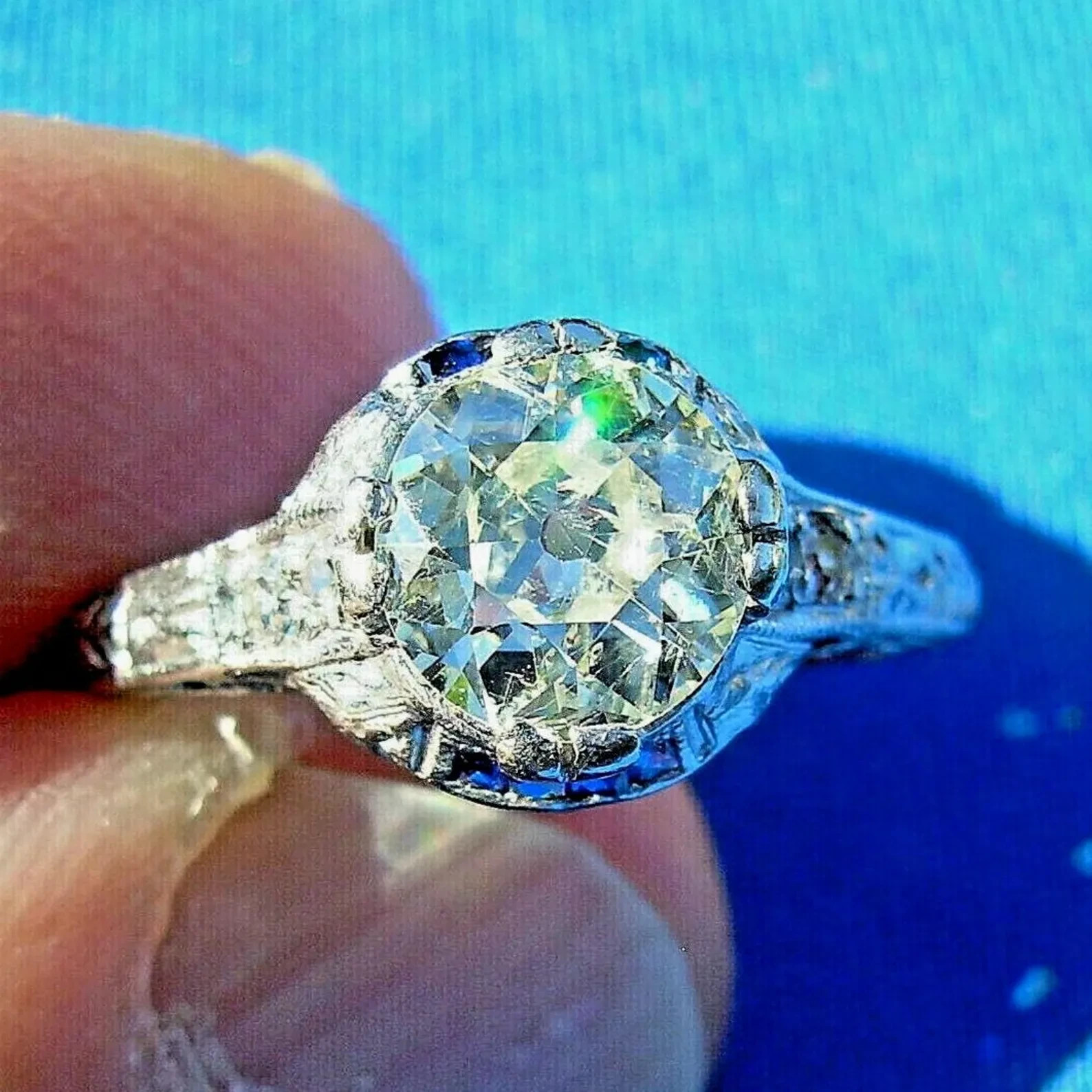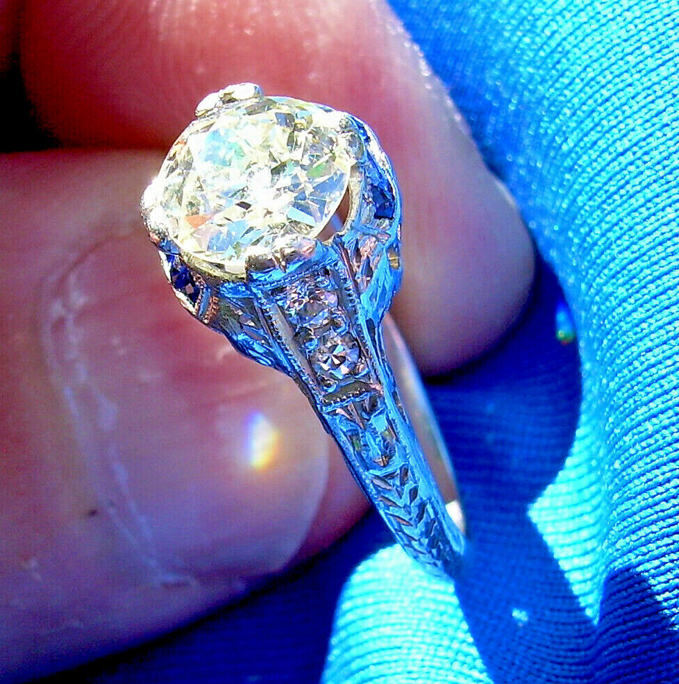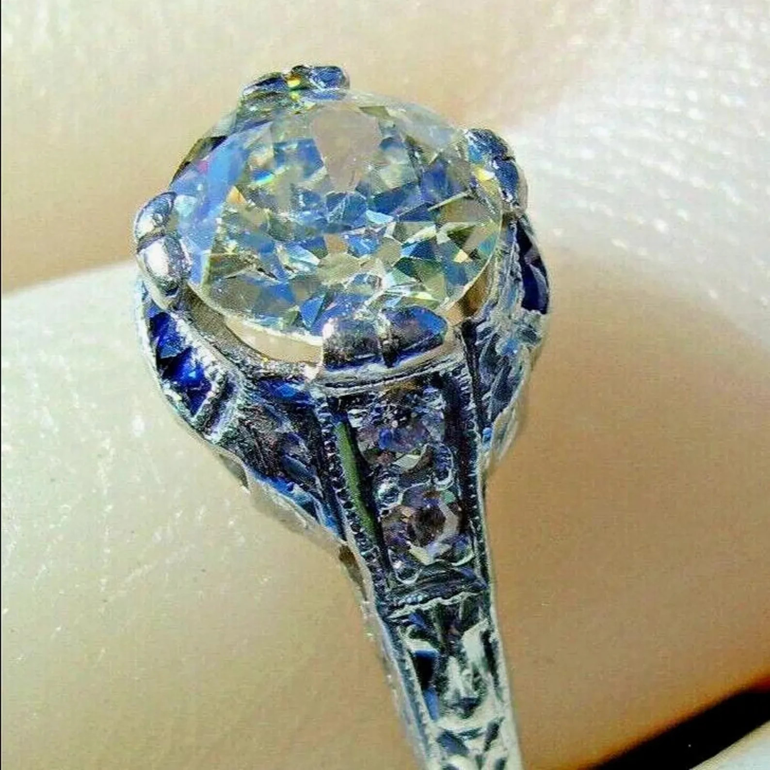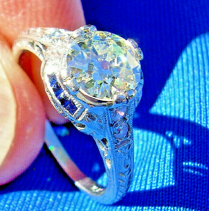 - Earth mined Diamond Sapphire Art Deco Engagement Ring Vintage Platinum Statement