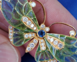 Translucent enamel 18k gold diamond sapphire filigree broach.