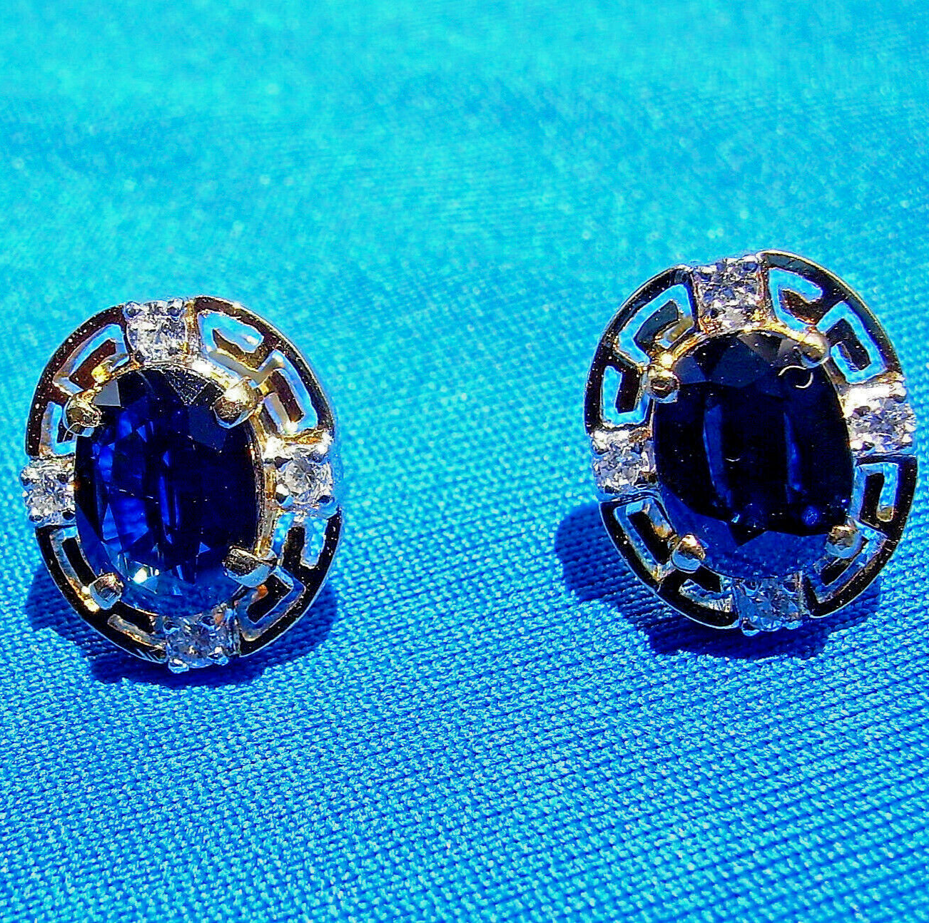 - Earth mined Sapphire Diamond Deco Retro Earrings Button Studs 14k Solid Gold