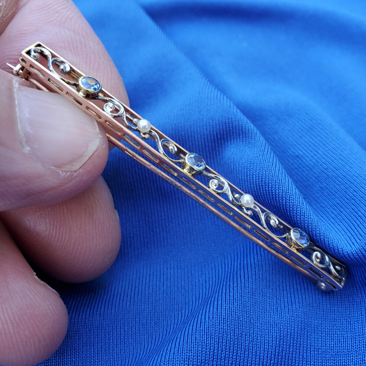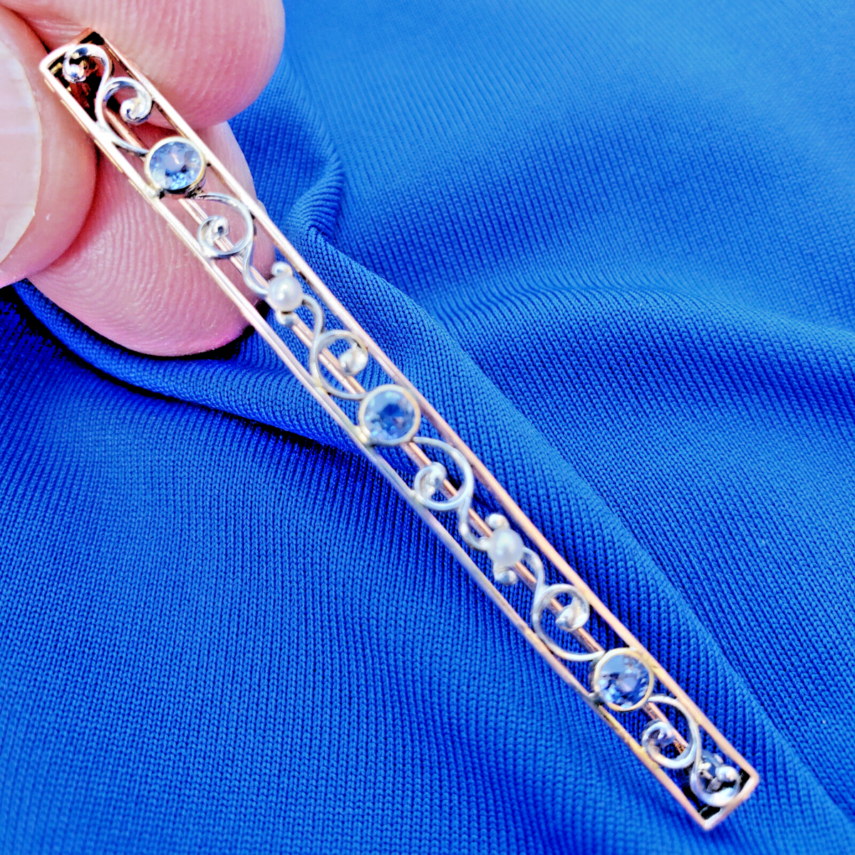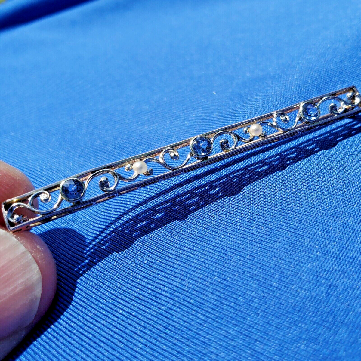 ANTIQUE 20s FLAPPER ERA ART DECO SAPPHIRE PEARL BAR PIN.