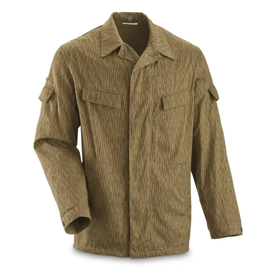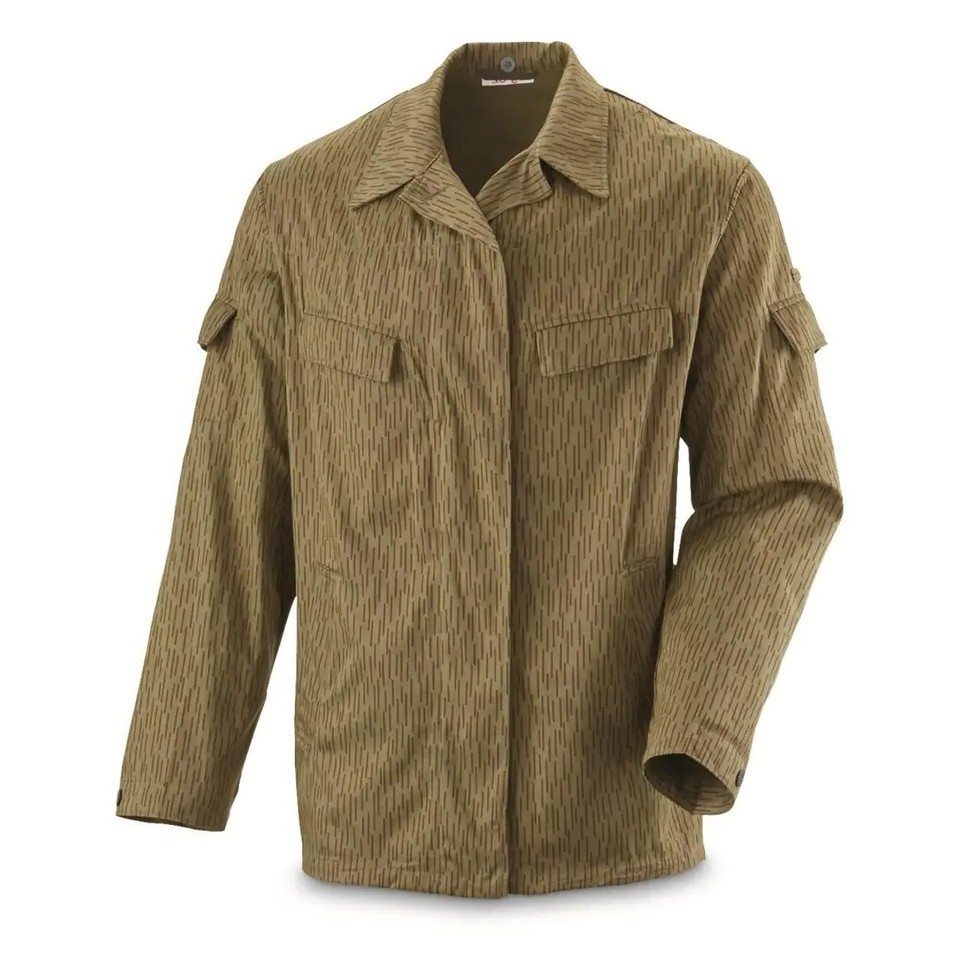 Step back in time with the authentic East German Army Strichtarn Camo Summer Field Jacket, a genuine piece of military history. Finished in the distinctive East German Strichtarn camo pattern, often referred to as "rain drop camo," this jacket offers both style and functionality. Made from a durable cotton polyester blend, it is designed to withstand the rigors of field use while providing comfort in warmer conditions. The jacket features a button-front flap for a secure closure, two button-flap chest pockets for essential storage, and two button-flap sleeve pockets for added convenience. The elastic detailing at the back hem ensures a snug and secure fit, making it a practical choice for outdoor activities. Whether you're a military history enthusiast, a collector, or someone who appreciates unique and functional apparel, the East German Army Strichtarn Camo Summer Field Jacket is a must-have addition to your wardrobe.