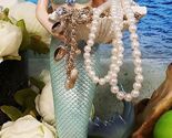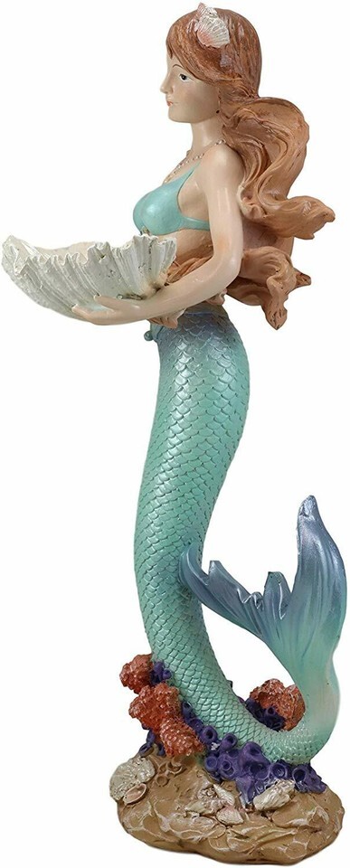 ? This fantastic figurine features a sultry siren holding a small shell bowl! You can put a few small bits or bobs or a votive candle in there, and she'll look after them for you. The mermaid has capiz blue-green scales with an iridescent shimmer, and auburn hair. She rests amongst the colorful corals. Unique and magical!