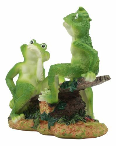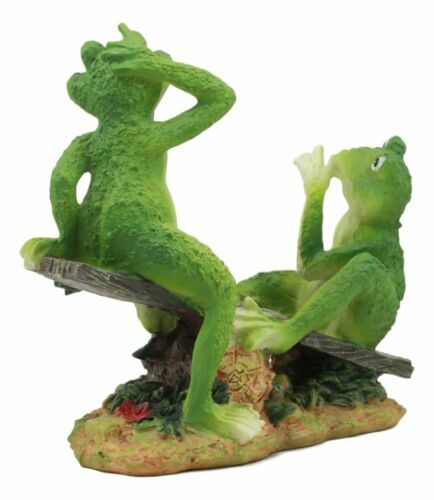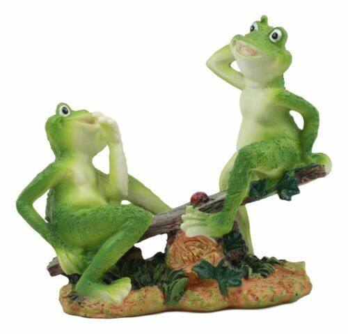 ? This whimsical sculpture features two best friends enjoying each other's company in the middle of the forest. It is another lazy day of summer and so these buddy frogs have put together a creative seesaw out of wooden logs. They are not the only ones having fun because in the center of the plank is a tiny ladybug enjoying the thrill ride!